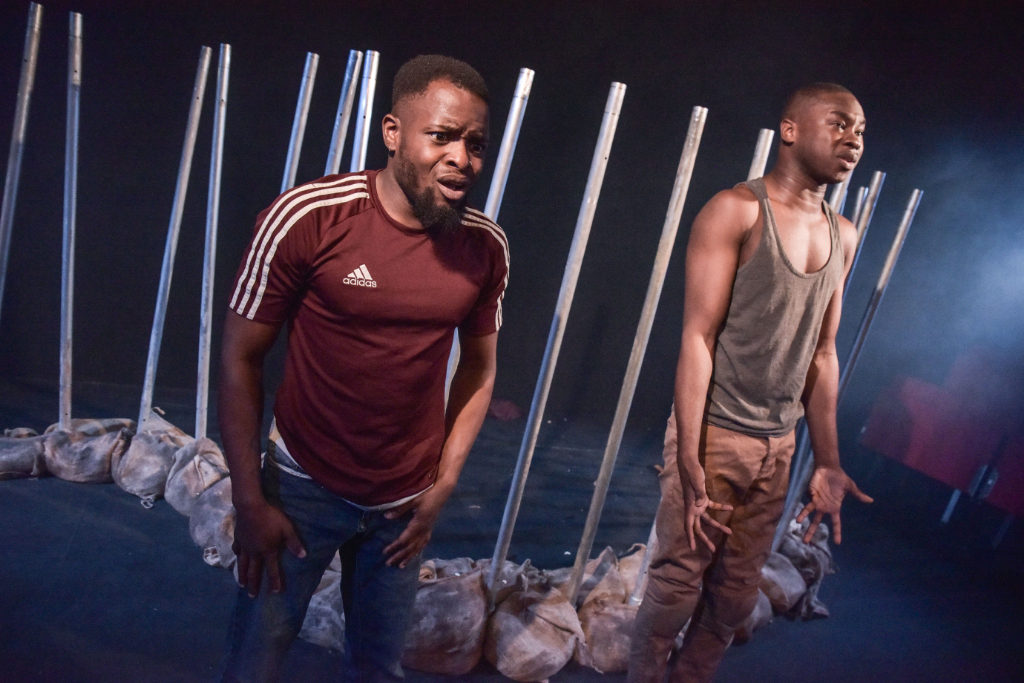 Obisesan reduces the book into a two-hander and takes up where the novel leaves off: Ben (David Alade) and Obembe (Valentine Olukoga) reunite by a river near their local village and go through the emotional turmoil of recounting the tragic events of the past. Morphing frequently – and seamlessly – into other characters from their childhood, they narrate how a curious encounter with a local madman and prophet stains the relationships within the family. Throughout the production, designer Amelia Jane Hankin creates a sense of claustrophobia through a series of metal poles which serve as a barrier.