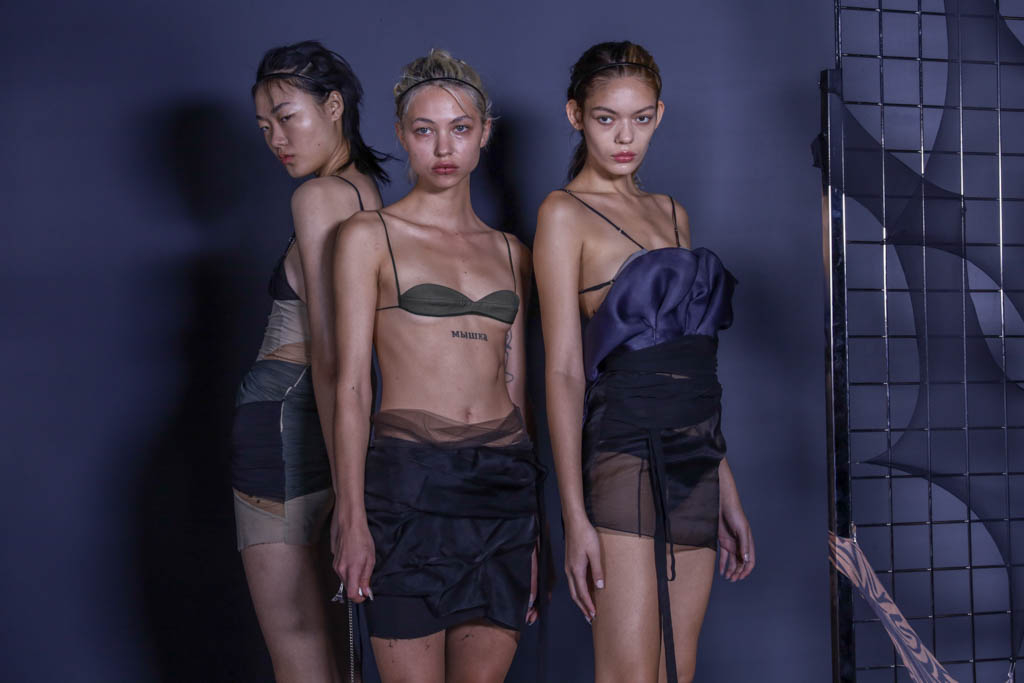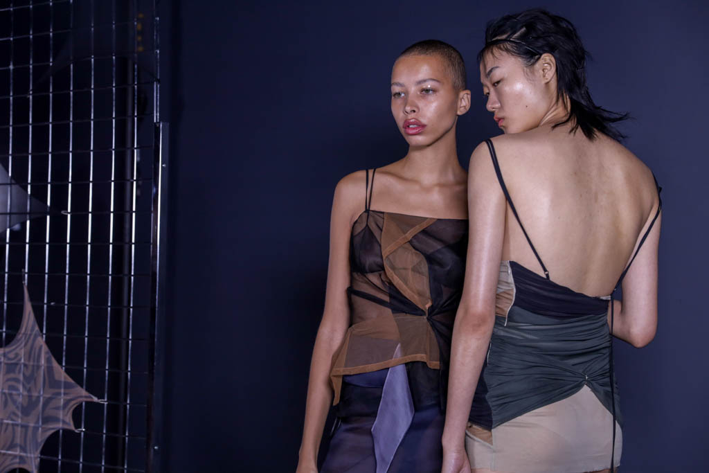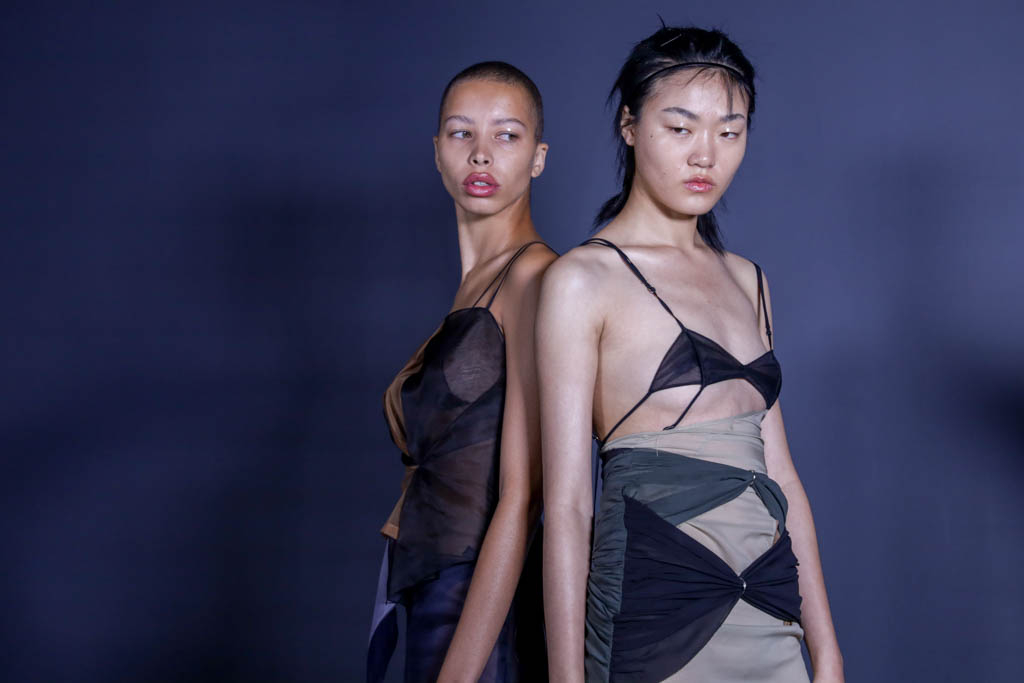 The brand focuses on the contrast between soft details and fabrics with harsh lines and spaghetti straps, challenging high-end luxury with unexpected twists and juxtapositions. Body-hugging silhouettes are elevated through layered sheer fabrics and mismatched colours. 90s influences abound, with key looks for the range including mini-bras and miniskirts which flatter and frame the body, the sharp lines and breaks subverting the stereotype of short “sexy” dresses.