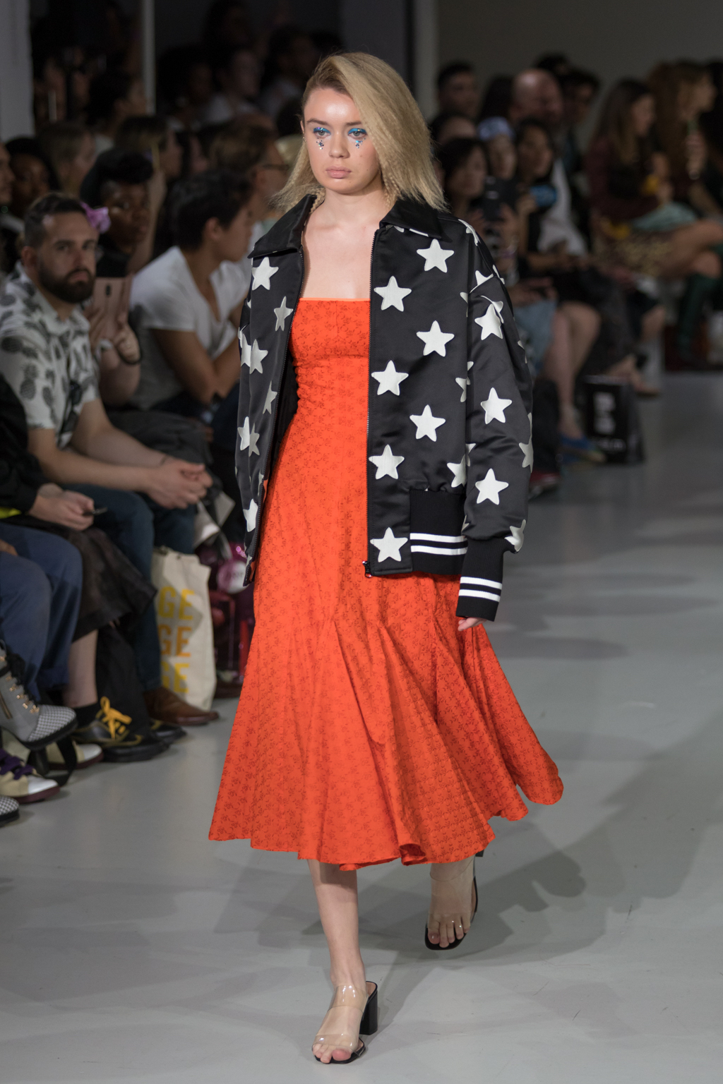 Simon Mo’s SS20 season focuses on the impact of artificial light on the environment. The collection pairs classic pyjama silhouettes, neon trimmings and contrasting colours with vintage blanket prints and dramatic star prints made from recycled yarn, topping the looks off with printed metallic gauzes resembling angelic halos. The brand aims to highlight the impact of light pollution on nocturnal wildlife and humans, creating a space for all the insomniacs wandering through the night.