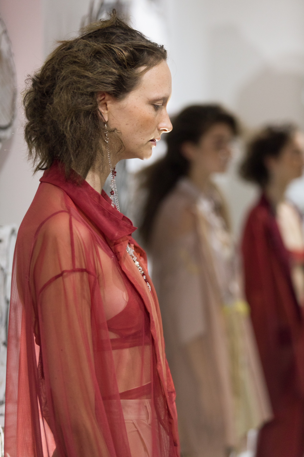 There is a primary focus of flowing, see-through material throughout the outfits in the new collection. Sheer pants, cut-out shirts and sleeves create a sense of natural forms and glimpses of body. Bold and structured pieces juxtapose garments as outfits are paired with oversized stiff blazers.