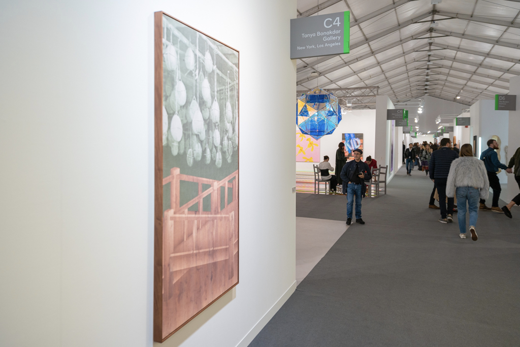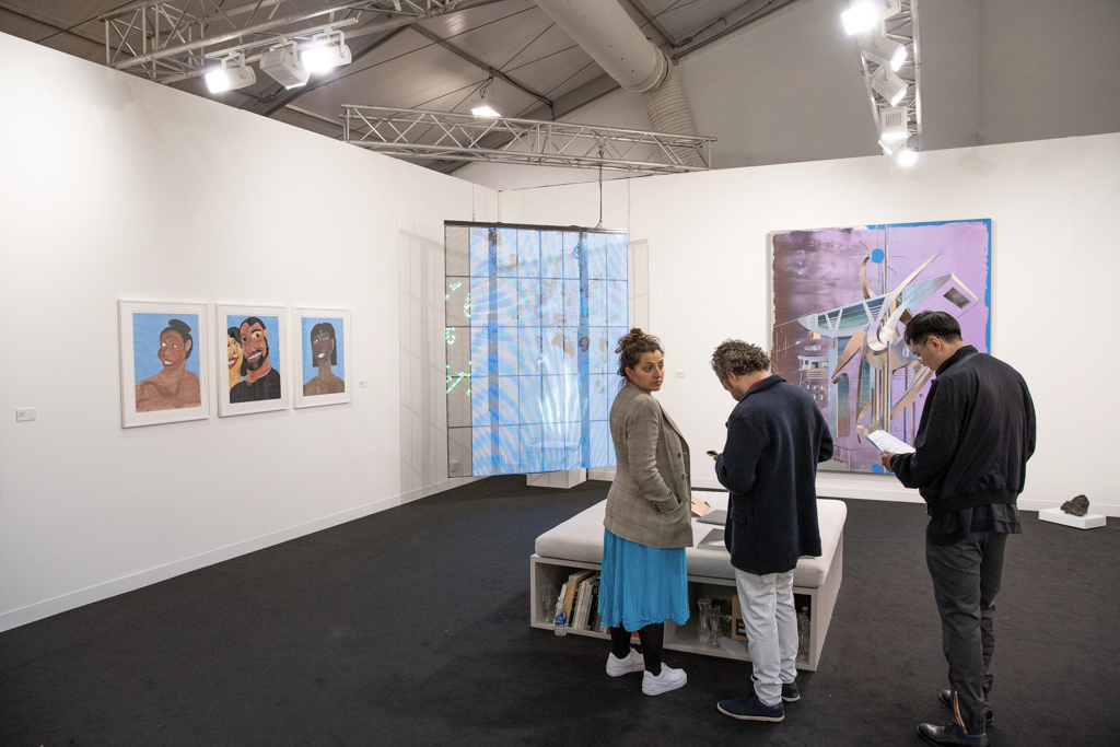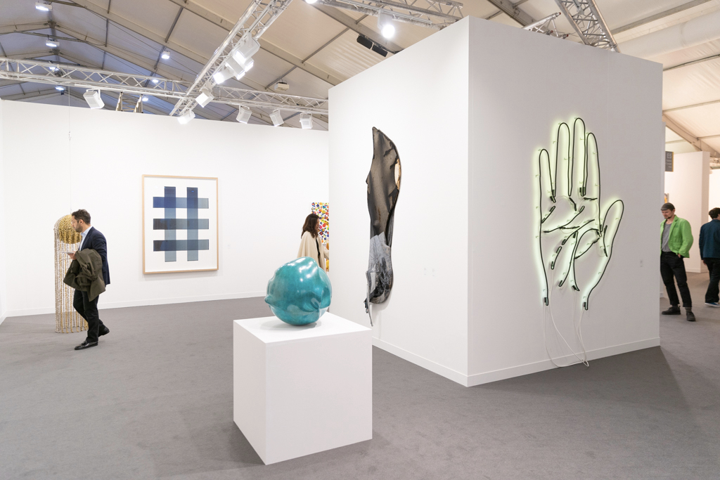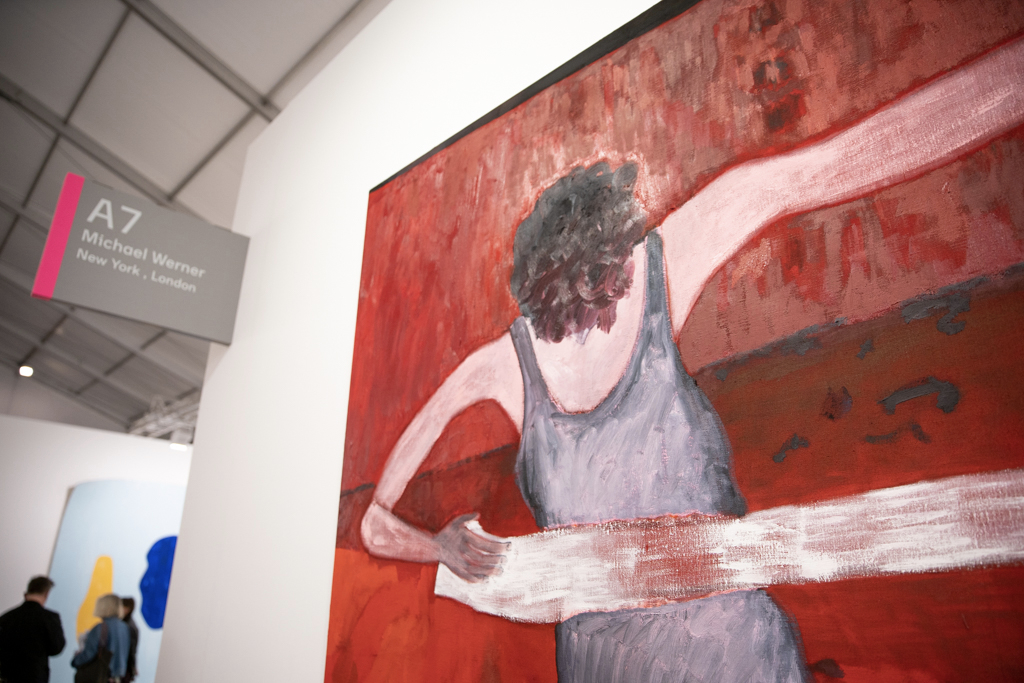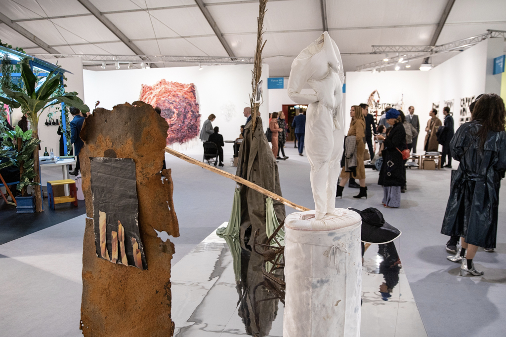 Meanwhile, the installation by Donna Huanca at Simon Lee Gallery (booth E6) has been the talk of the fair. This immersive installation combines wall-based works with sculptural paintings, mounds of white sand, a sound piece and even a custom-made scent inspired by the fragrance of Palo Santo, a holy tree native to South America and widely used in purification ceremonies. The booth’s curators write: “Huanca’s two-dimensional painting practice is fundamentally connected to the performative elements of her work. In six new ‘skin’ paintings, photographs of her performers’ bodies are blown up and transposed to canvas, where they are re-worked with paint.”