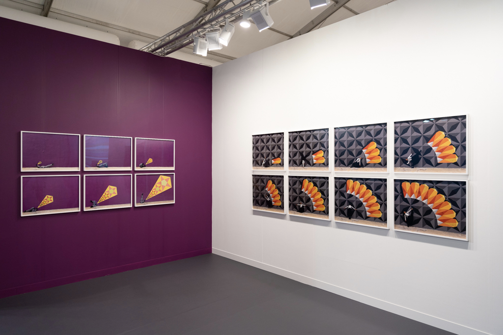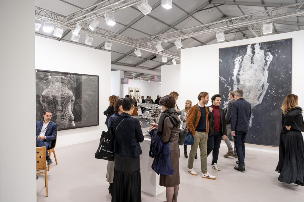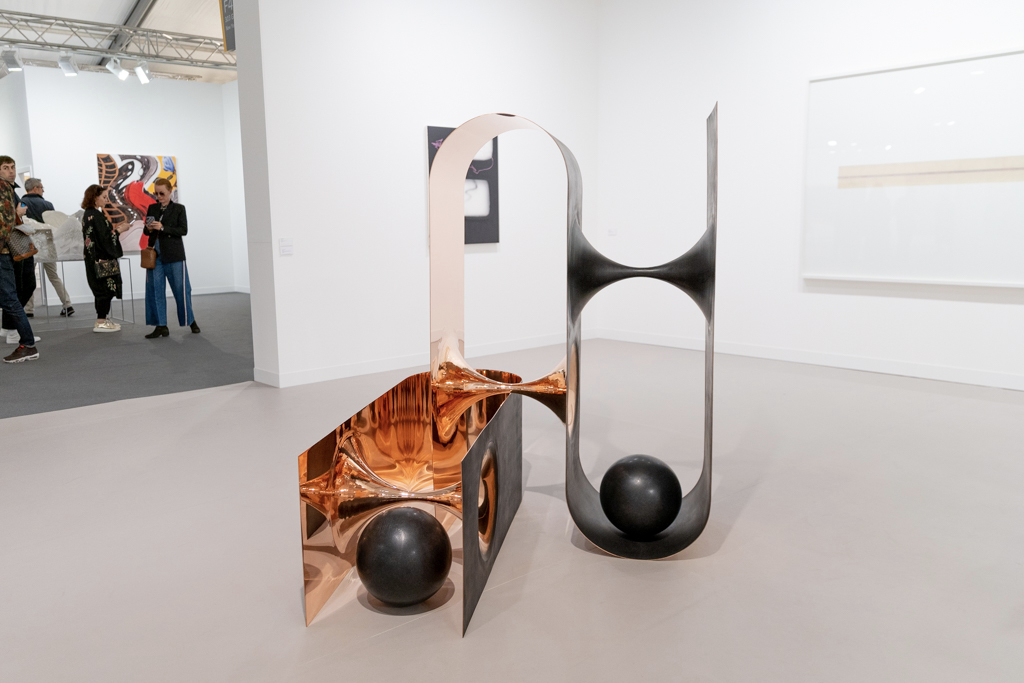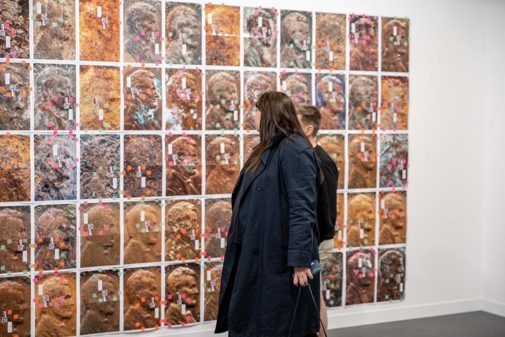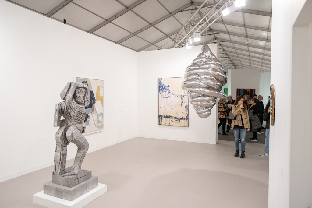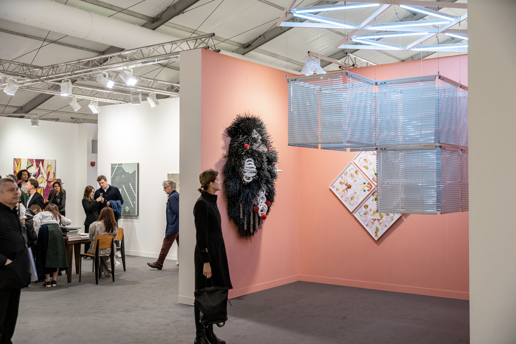 Meanwhile, the installation by Donna Huanca at Simon Lee Gallery (booth E6) has been the talk of the fair. This immersive installation combines wall-based works with sculptural paintings, mounds of white sand, a sound piece and even a custom-made scent inspired by the fragrance of Palo Santo, a holy tree native to South America and widely used in purification ceremonies. The booth’s curators write: “Huanca’s two-dimensional painting practice is fundamentally connected to the performative elements of her work. In six new ‘skin’ paintings, photographs of her performers’ bodies are blown up and transposed to canvas, where they are re-worked with paint.”