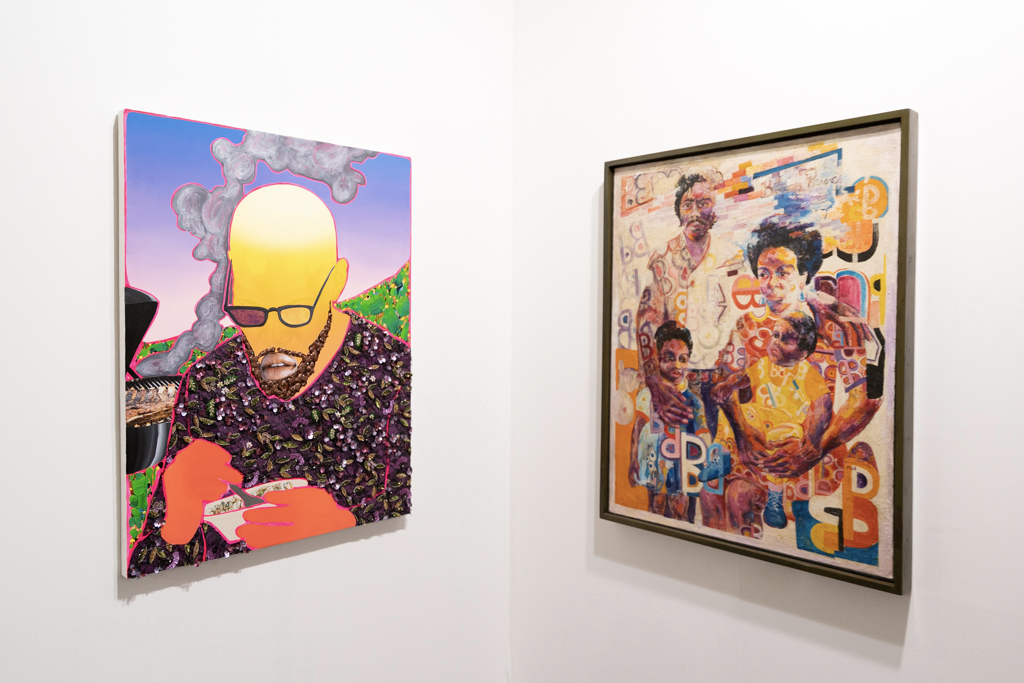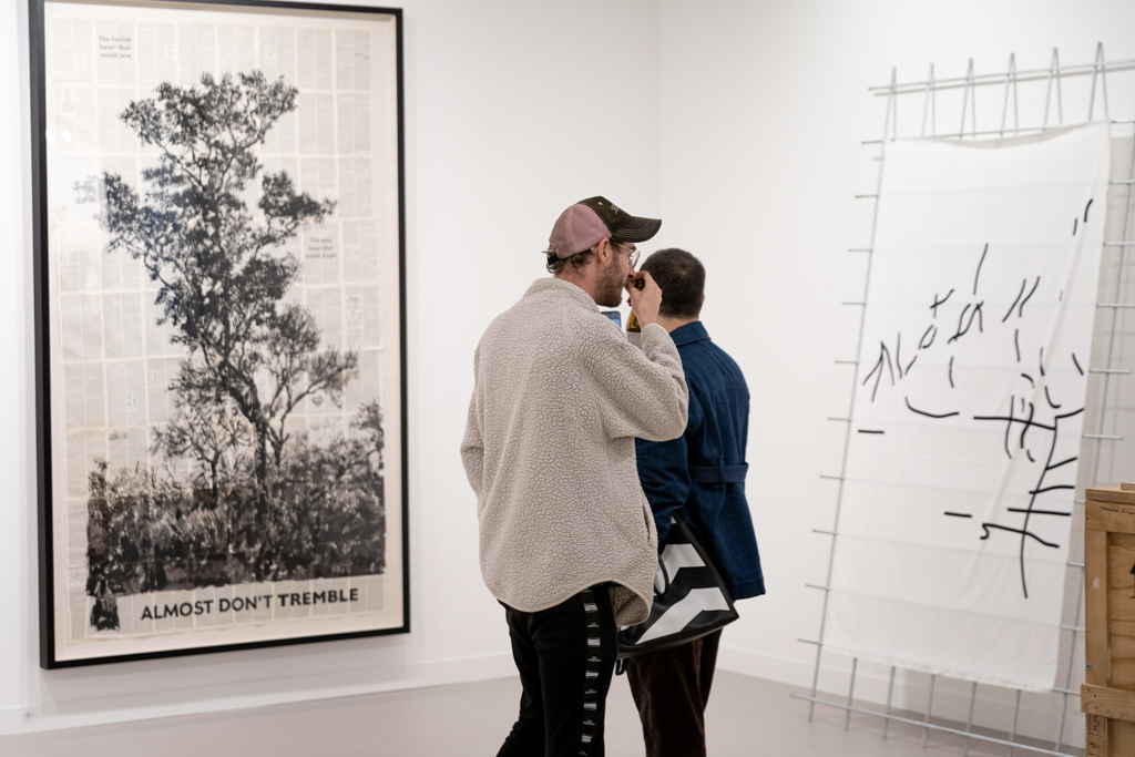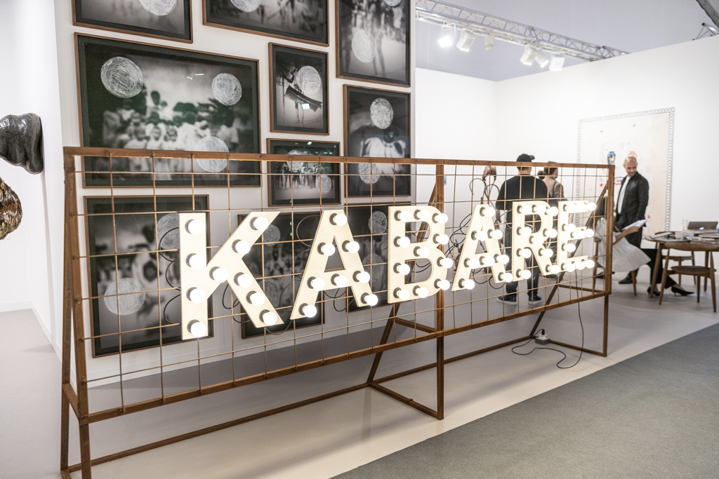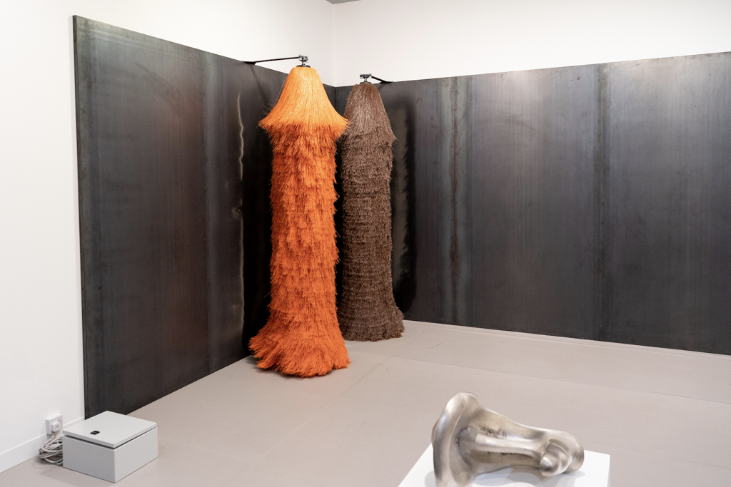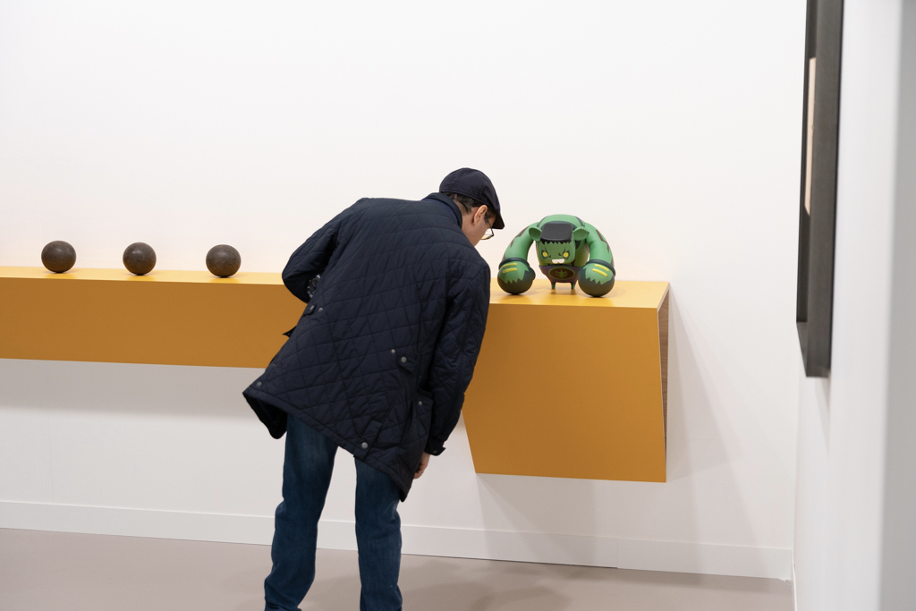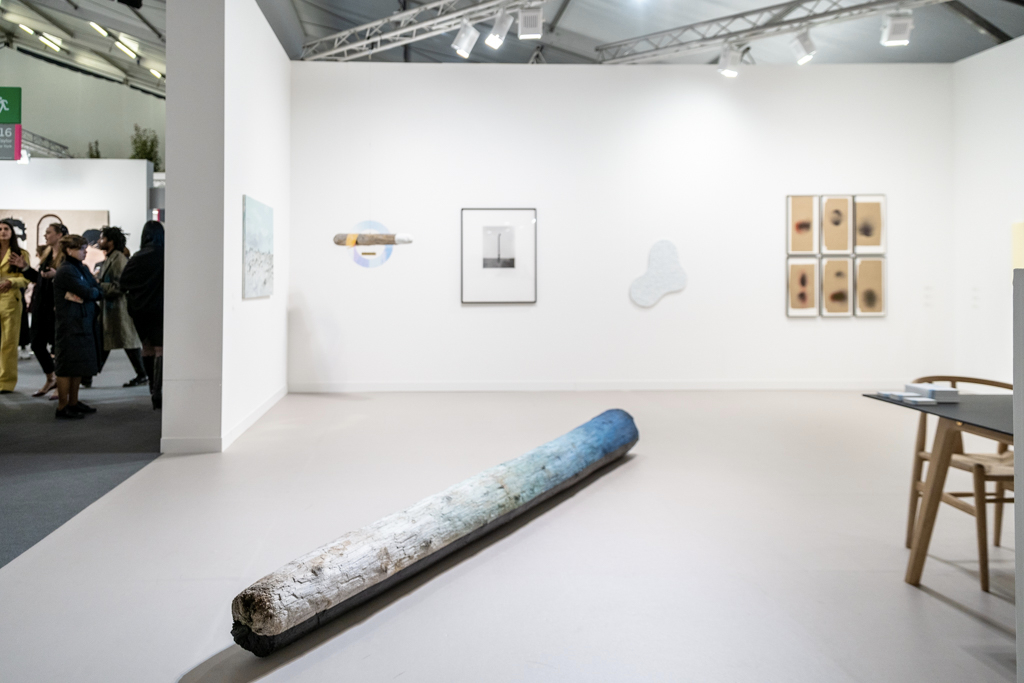 Over the aisle, Canadian gallery Cooper Cole (booth H2) has gone for a very different atmosphere. Their display of four artists is beautifully arranged across an understated booth painted an unexpected sage green. Particularly intriguing are works by Cree and Metis artist Gabrielle L’Hirondelle Hill, which include a pair of small bunny rabbits made out of tobacco and hosiery.