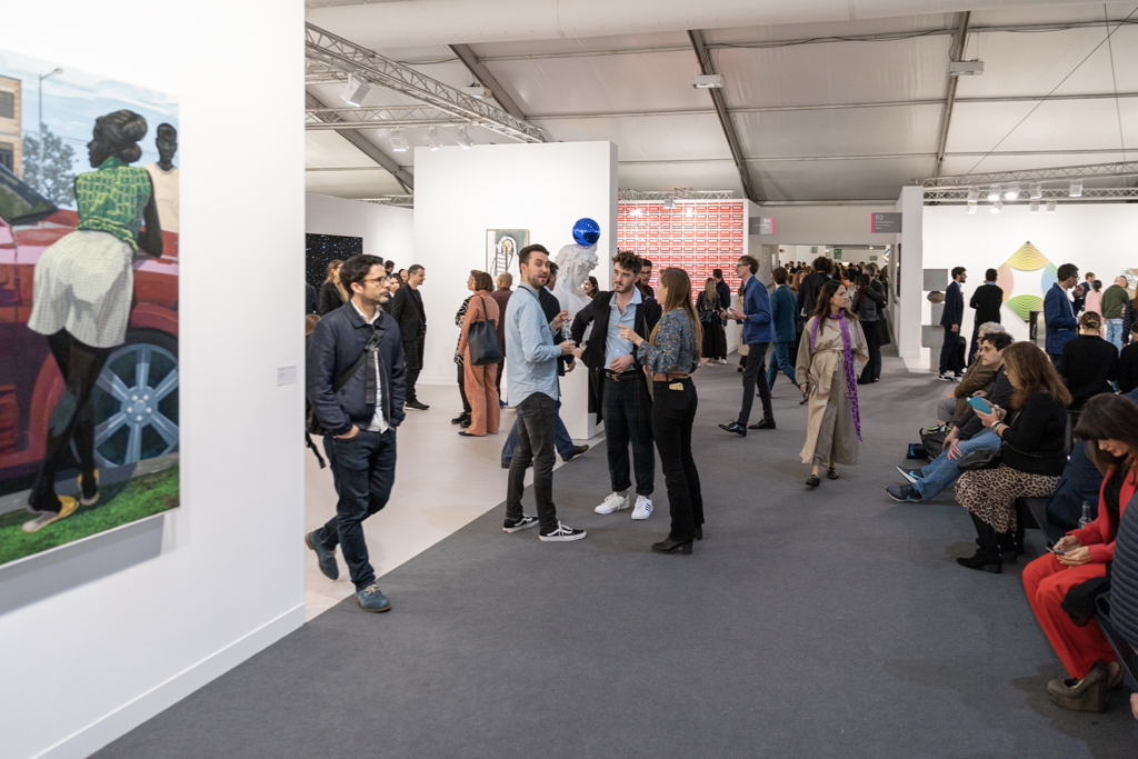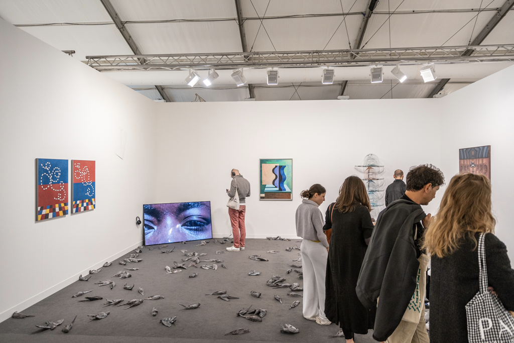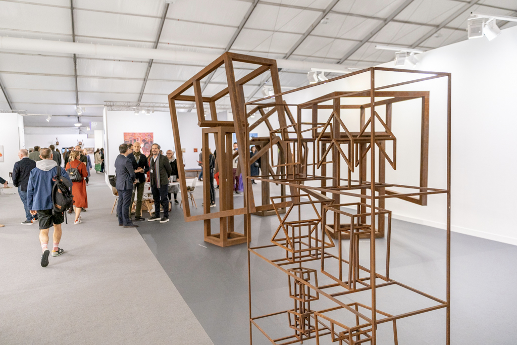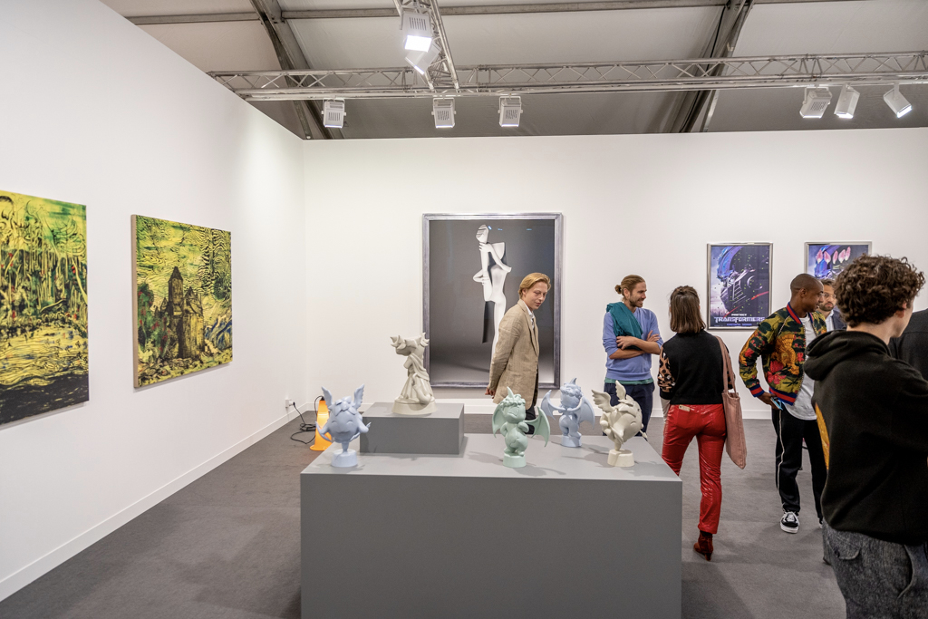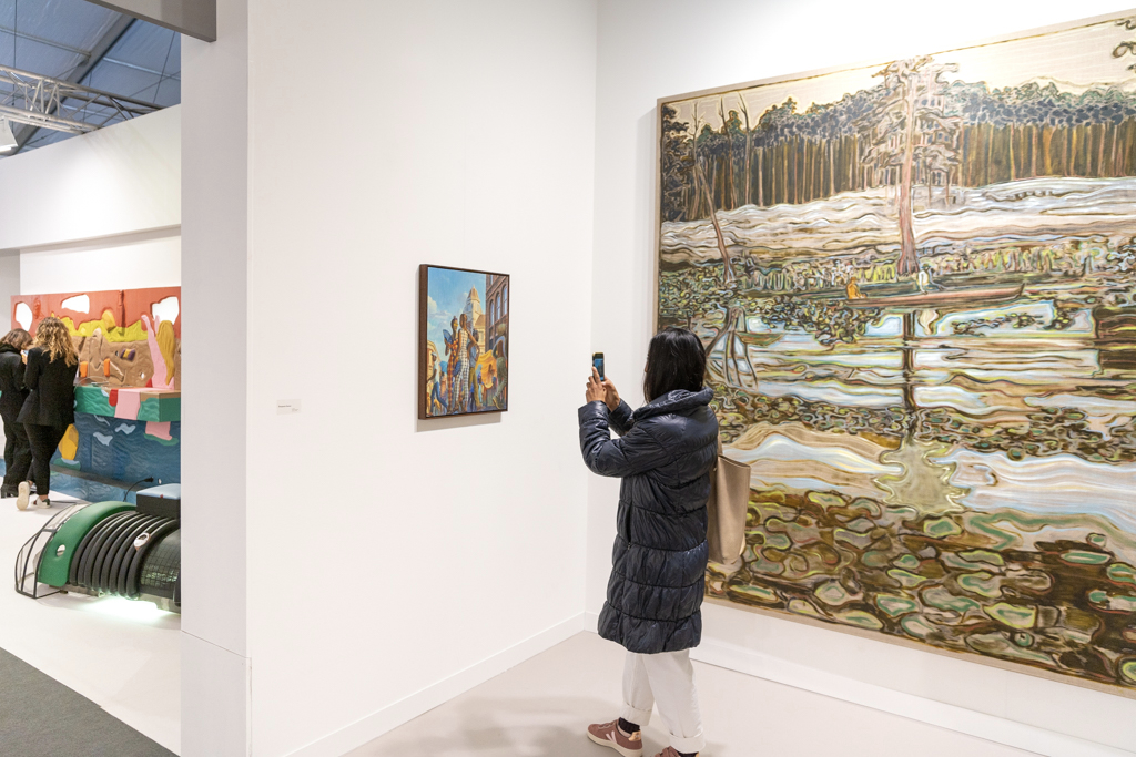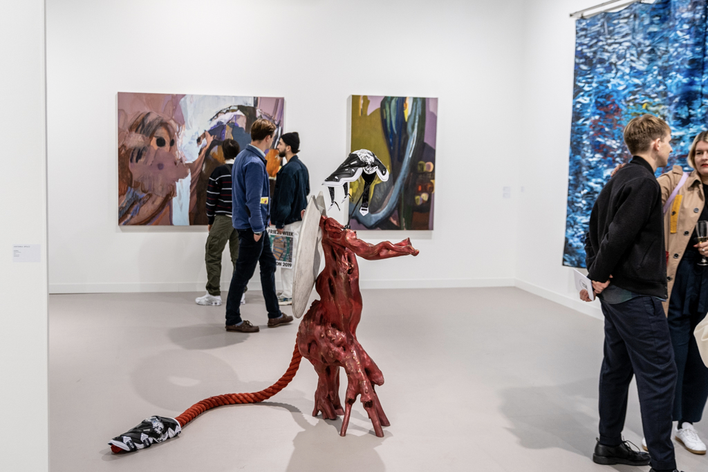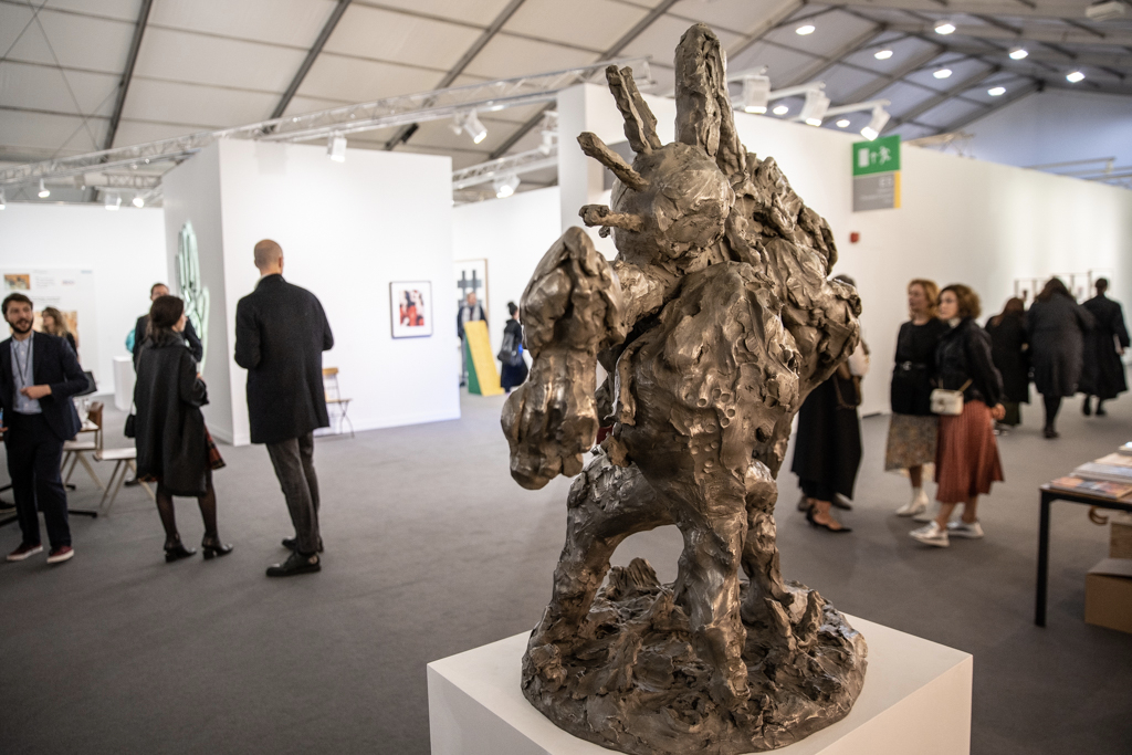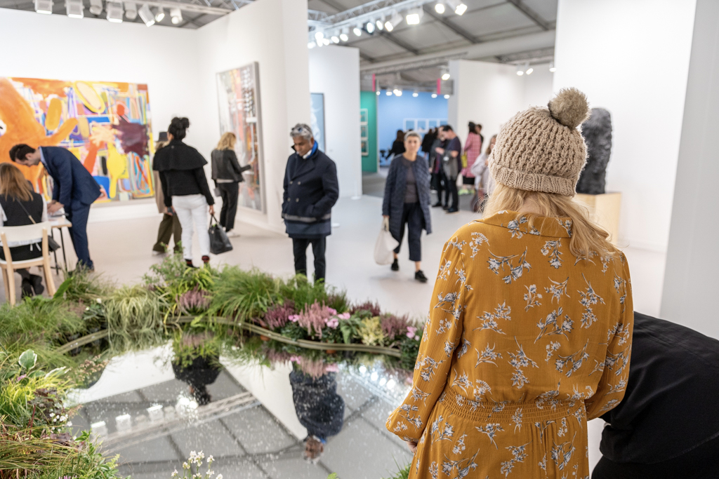 The best of the rest… also worth mentioning is a colourful exploration of human-animal relationships and gender at 80M2 Livia Benavides (booth H33). There are also 180 dead ring-necked parakeets made from salvaged lead by Patrick Goddard at Seventeen Gallery (booth A15), and a beautiful mirrored pond surrounded by plants by Urs Fischer at Galerie Max Hetzler (booth A10).