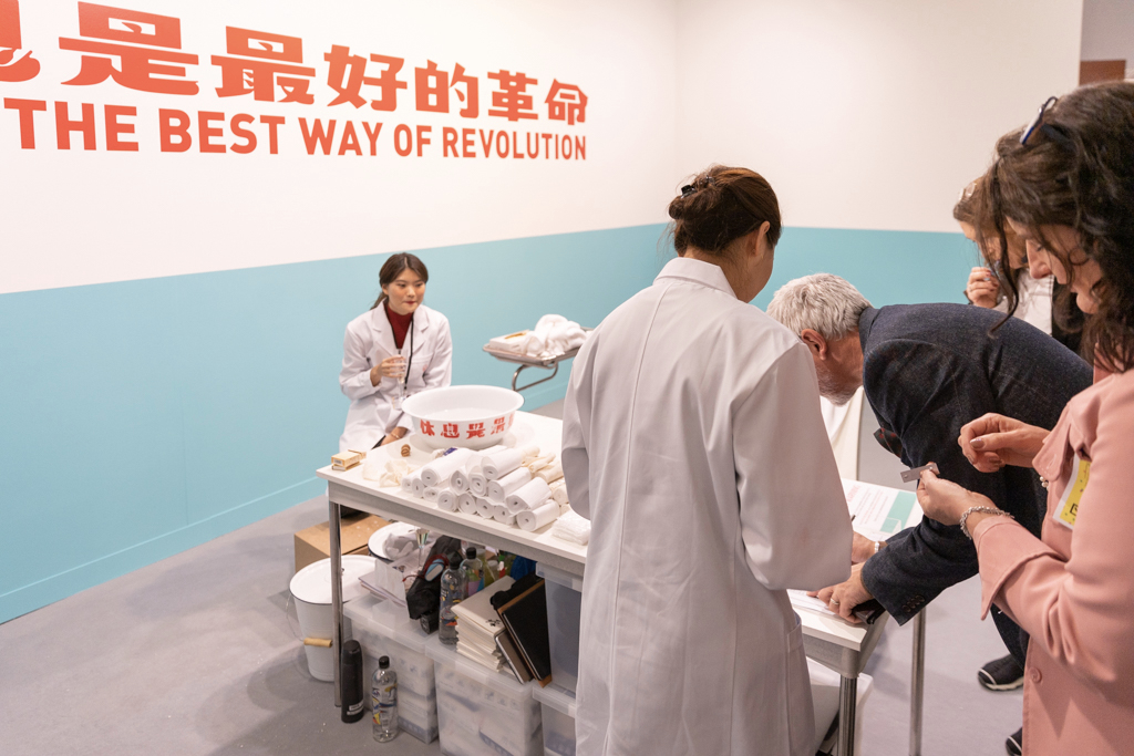 Nearby, the Frieze Focus section offers some younger galleries to showcase more experimental work by emerging artists. If you’ve only got a short time at the fair, head straight here – there will almost certainly be something you’ve never seen before. One highlight – and one of the strangest things at the fair – is Tang Dixin’s participatory artwork Rest Is the Best Way of Revolution, hosted by Shanghai-based gallery Aike (booth H12). In this unsettling installation, visitors are invited to get part of their body bandaged by an in-booth team of fake doctors and nurses.