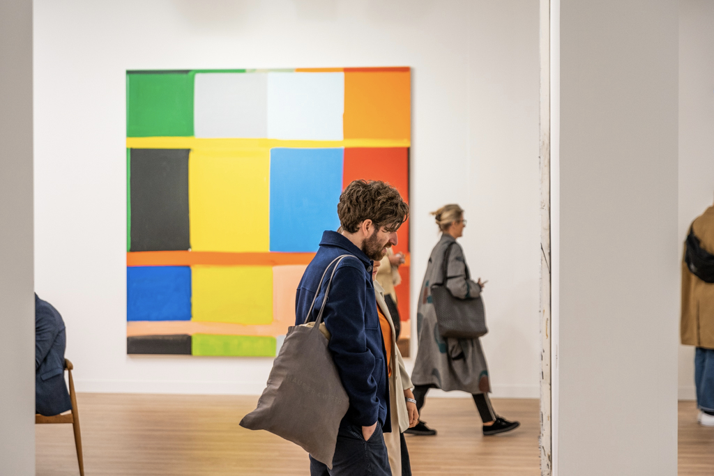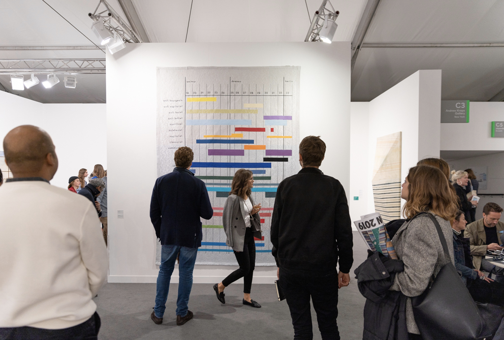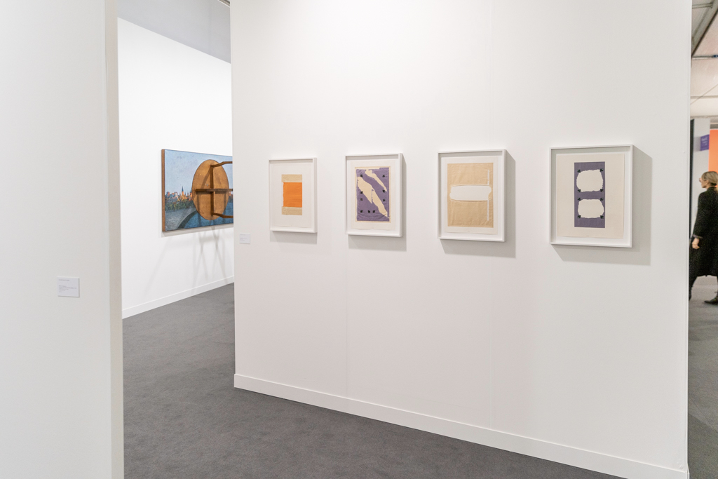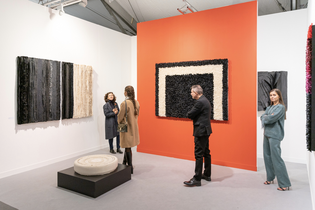 London-based Kate McGarry Gallery (booth A12) has also bravely chosen a solo presentation, with a small but perfectly chosen selection of large paintings by Bernard Piffaretti. Each of Piffaretti’s canvases is dissected by a vertical line, and the abstract image on one side of the divide is repeated (almost identically) on the other, leading the viewer to question which image is the “original” and which the “copy”.