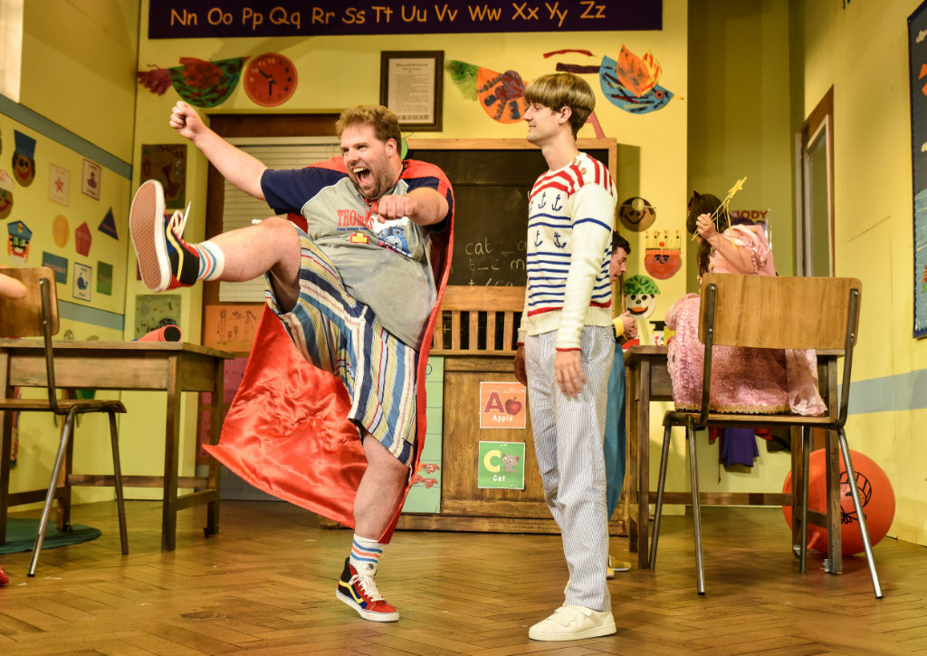 The comedy follows a group of friends in different periods of their life, starting off as trouble-making toddlers in their oversized Year 2 classroom (cleverly designed by Fly Davis). In the opening school assembly, we learn a bit about each child as they share stories of their weekend – from naughty Spencer (Henry Lewis), with his penchant for defecating in his corridor, to Katie’s (Charlie Russell) womanising father and Moon’s (Nancy Zamit) posh upbringing. The scene’s obvious sexual innuendos and slapstick cracks set the tone as we learn just enough about each character to appreciate how they will evolve throughout the years.