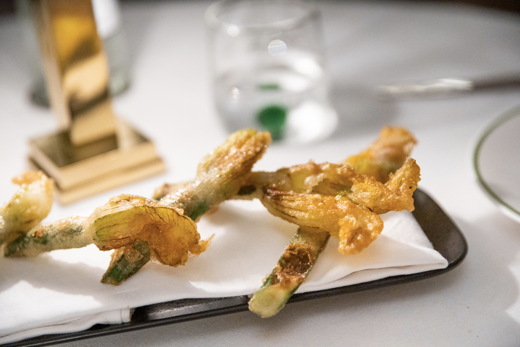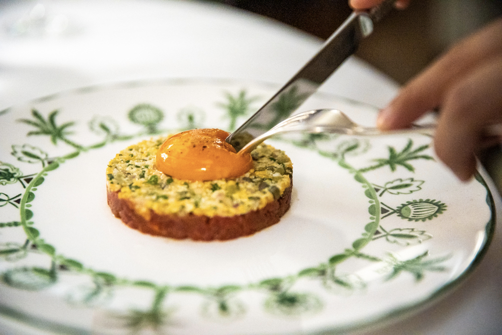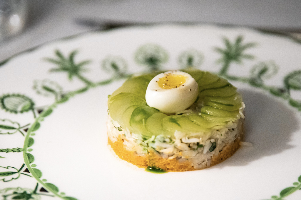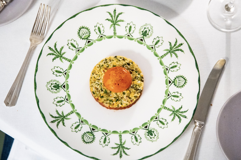 For someone who had just spent a week craving a grouse – with several failed attempts to find one – spotting it on the menu is already a pleasure. After devouring the bread (which you could smell from a distance) and butter, and a delicious portion of fried courgette flowers with truffle honey, we begin our meal with two starters that have more than one thing in common. Graciously plated in a pressed round shape, a beef tartare of Lake District provenance and a dressed Cornish crab salad build on three different layers and textures, both topped by an egg.