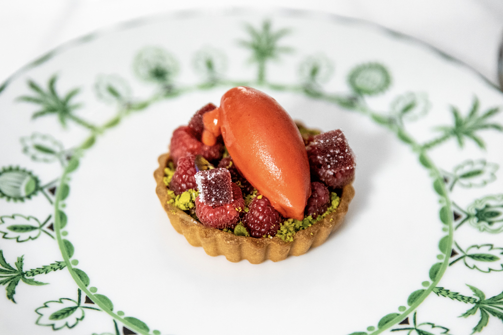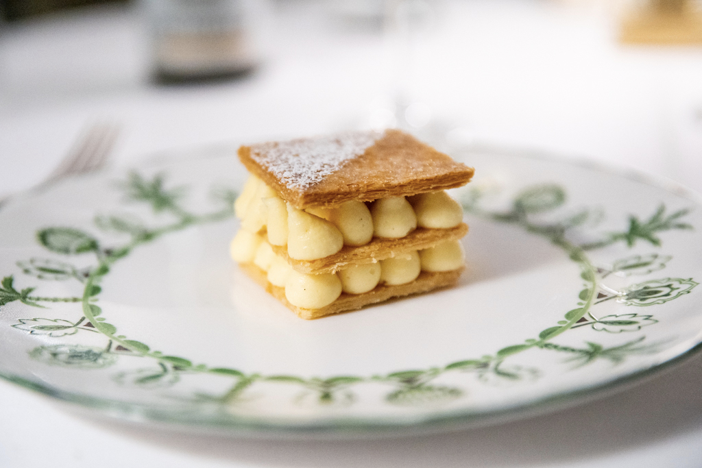 A raspberry and pistachio tartlet seems taken straight from a patisserie. I wasn’t going to order it but the waiter’s satisfaction in describing it makes me change my mind quickly. And, oh boy, it is the right choice. The mille-feuille, with three layers of puff pastry and two of custard, does what you look for in this dessert, just don’t expect goose bumps.