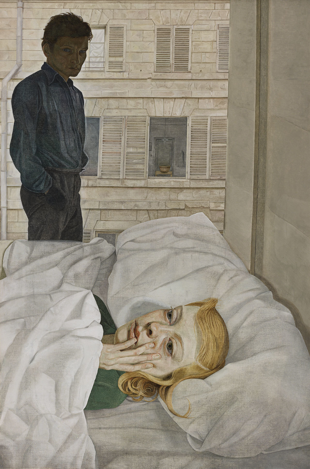 Much of the early work draws special attention to the figures’ eyes. In Hotel Bedroom (1954), the artist sits in a Paris hotel watching his wife of the time, Lady Caroline Blackwood, lying in bed. This was the last painting he produced while seated. City of Love it may be, but no marital bliss is to be found here. His wife faces away from him, ashen and with swollen eyes, one hand to her cheek. Freud is a menacing presence in dark silhouette, the painting loaded with pathos and tension. By placing his own image into a portrait of another individual, he draws attention to the relationship between artist, model and viewer.