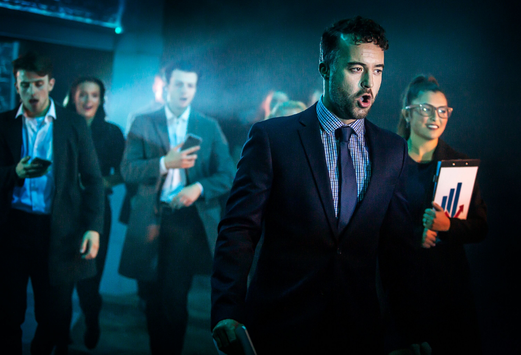The musical has a satirical tone which mostly hits its marks. The voiceover sounds reminiscent of a Big Brother presenter. The jokes use pop culture to get the audience in on the punchlines. Yet, ultimately the script isn’t as modern as it purports to be, and the fabulous singing-and-dancing cast is let down by roles that seem stereotypical and unoriginal. Stepsisters Clodagh (Michaela Stern) and Dana (Natalie Harman) stagger around the stage in a caricatured portrayal of working-class fame-grabbers. Nonetheless, their boisterous voices deliver cracking one-liners, and they are given a platform to share their incredible vocal range. The second comic relief is William George, the spin doctor for the mayor, whose lines recall the sharp-edged and insult-driven dialogue of The Thick of It.
