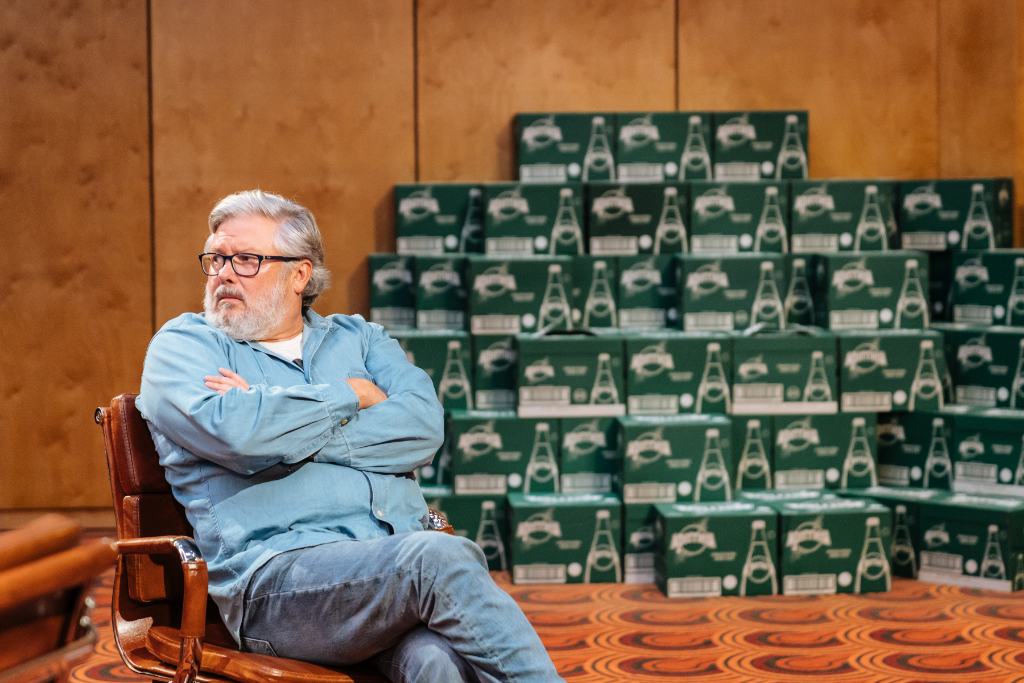 The table stretches out in the audience – we’re in attendance too. Boxes of Perrier, brought in ceremonially, are constructed like a throne. It gets weird in places. Like a cult. Time passes via the parade of outfits worn by Imogen Doel’s assistant Sarah – who, incidentally, is the comedic highlight of a very funny production. We’ve been there for hours and months equally, patiently waiting, like we always will, for the story that’ll unlock everything.