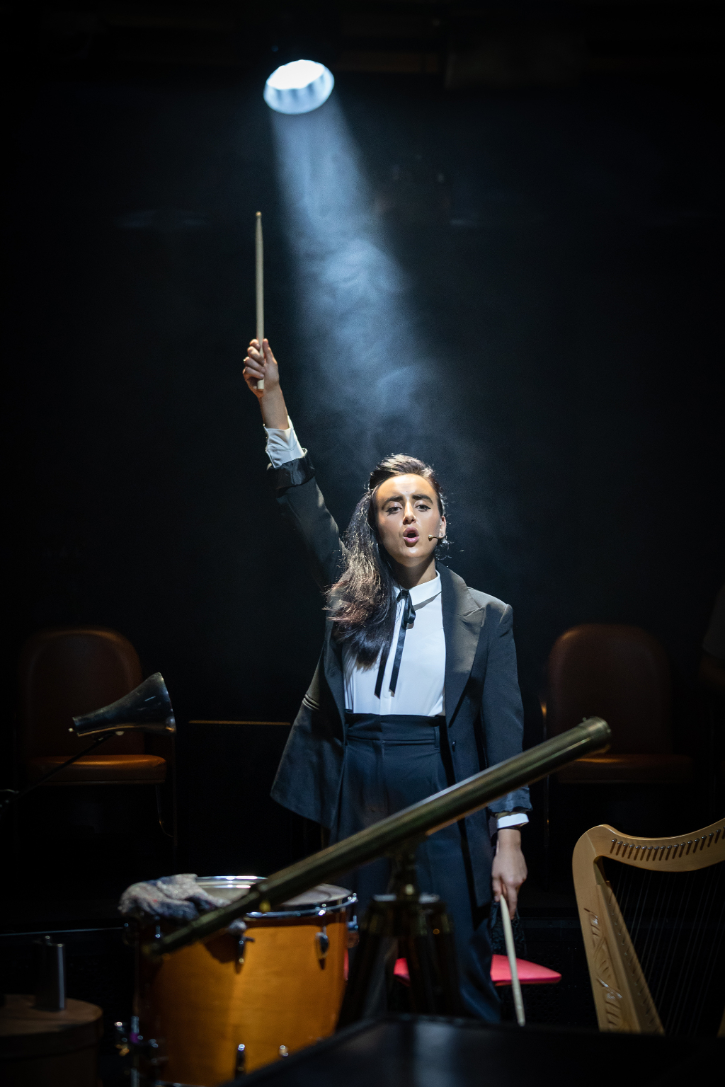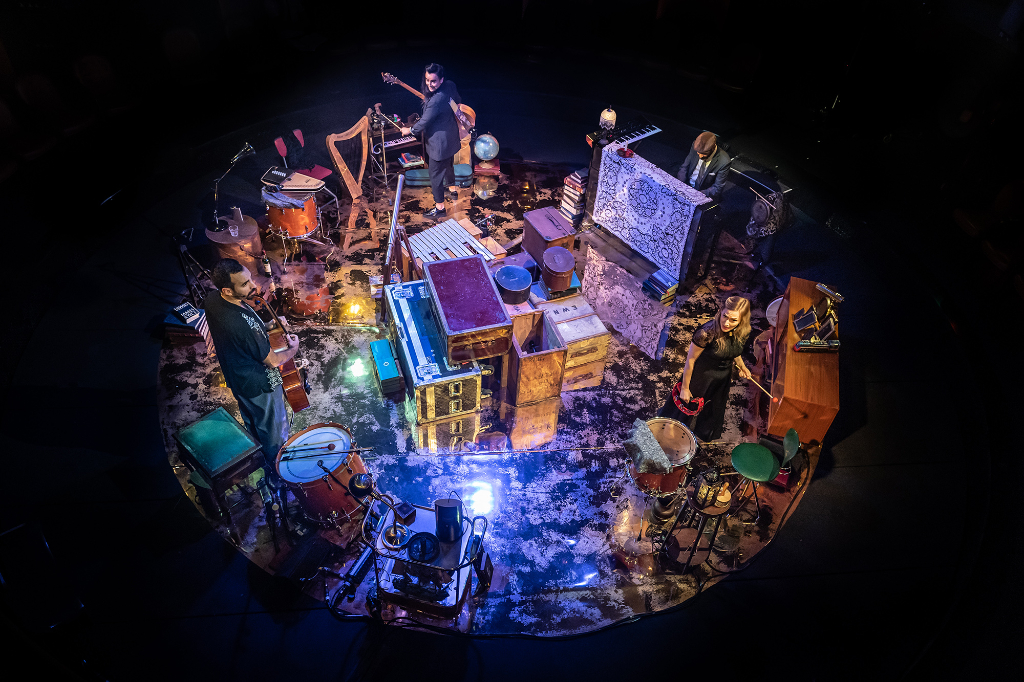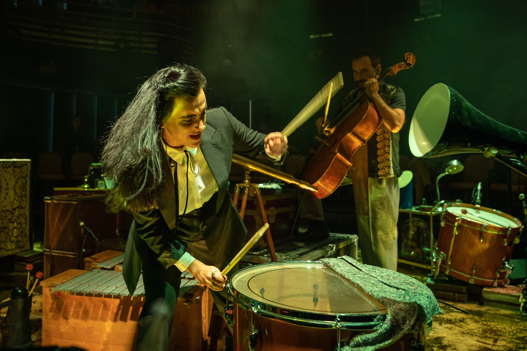 The cast, each playing multiple instruments, are astonishing. Zubin Varla at the piano, the de facto bandleader, his wonderfully distinctive pipes lending such character to the piece. Master cellist Niccolo Curradi, cheekily interacting with the audience. The beautiful clarity of Carly Bawden’s voice, especially near the end in Hero. And Maimuna Memon – an alternately unsettling, captivating and dramatic presence, the production’s tonal shifts best expressed through her performance.