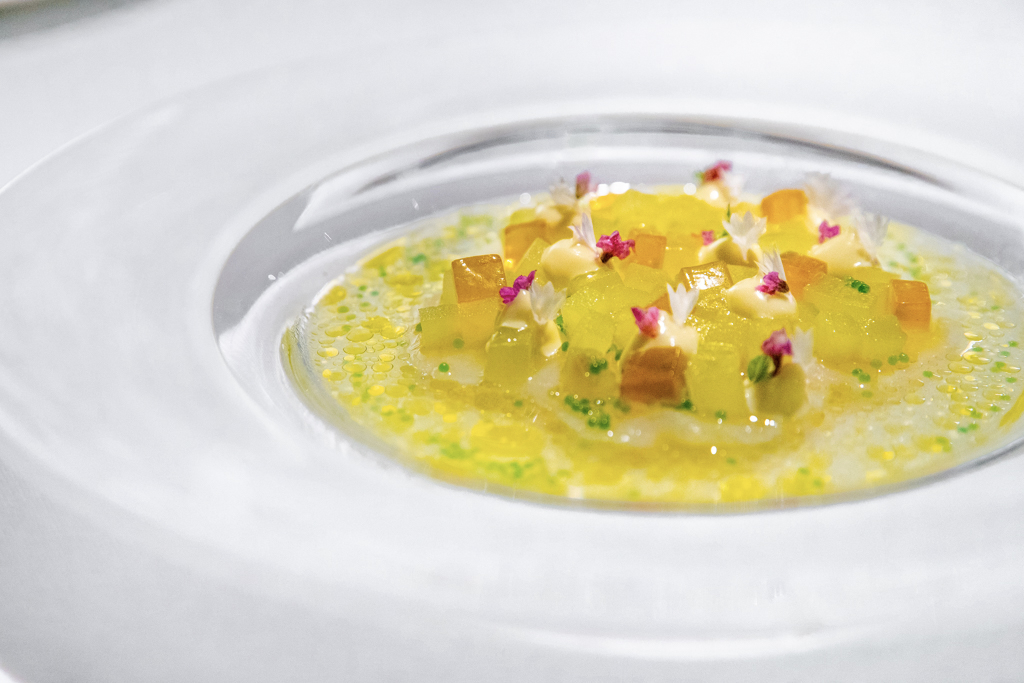The Wild Turbot, with Japanese mushrooms and katsuobushi broth, is an umami celebration – but subtle, sophisticated. Wine-wise, it broadens the range of possible pairings, with a light red and a structured white equally suitable. I pick a pinot noir from California (Moobuzz 2015), which also holds up the richness of the Aynhoe Park Venison. Served with wild ceps, stuffed truffle potato and its roasting juices, this game meat shows that the chef’s breadth is far from confined to seafood.