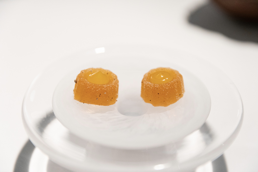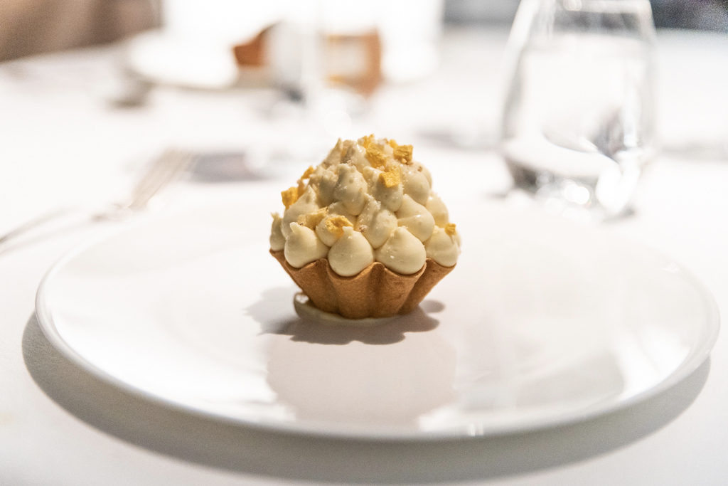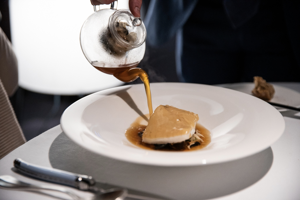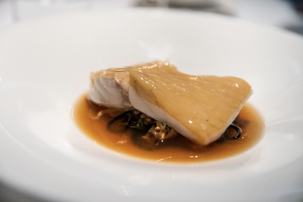 We begin our dinner with a series of mouthwatering snacks, in particular the cuttlefish black pudding. The Cornish Mackerel Tartare builds on a balance between the sapidity of the oyster cream, the acidity of the apple and herbaceous hints from the shiso. The tiny wasabi pearls deliver a Japanese twist. Despite the declared seafood focus, we dig into a beautiful Roast Veal Sweetbread, which hits all the right notes: cauliflower, black truffle and caramelised yeast. And if your pocket is deep enough, now that it’s in-season, they also offer hand-rolled spaghetti with 36-month-aged parmesan and white truffle (the real truffle).