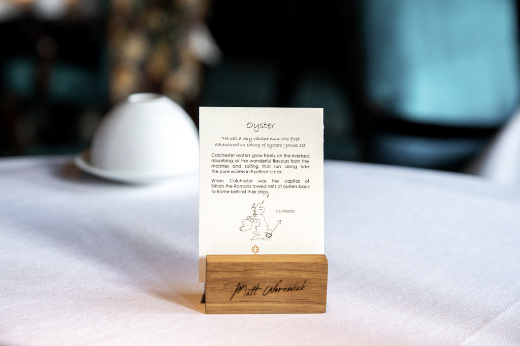 A trio of amuse-bouches kick off our lunch. Bread and butter follow. Colchester Oyster is the first of the five-course tasting menu. The oyster emulsion is served with cured sea trout and sorrel granite. The waiter puts on the table a card with further information about the dish’s main produce: the oysters grow freely on the riverbed in Pyefleet Creek and even the Romans were so impressed that they would tow nets of them back to Rome with their ships.