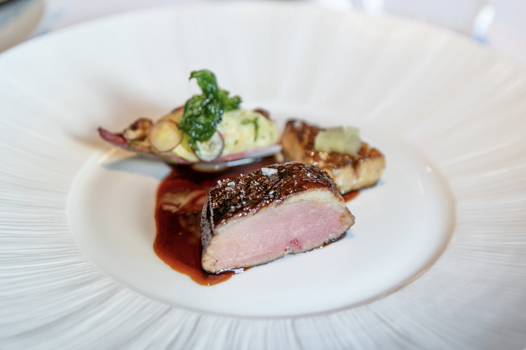 We also try the alternative course (for a supplement), a jaw-dropping Grade A Rougié Foie Gras. The liver escalope is sautèed with Maribelle plum and marigold. It’s refined and luscious. The main course is a wonderful Goosnargh duck – roasted – served with seared liver, Waldford salad and wholegrain mustard jus. They show it to us before carving it. “An unhappy bird is a tough bird, a happy bird is a tasty bird,” the late Reg Johnson, producer of these ducks, used to say.