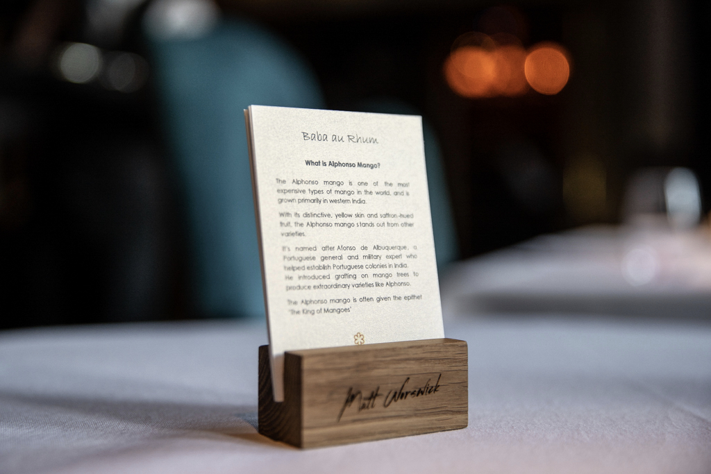 With 26 different options, the cheese trolley is one that doesn’t go unnoticed. Of course we have to try the Lancashire Bomb, made from a pasteurised cow’s milk. Other highlights from our selection are the Bath Blue and the Gubben from Ireland. Finally, we have the Baba au Rhum with passion fruit, Alphonso mango and lemon verbena.