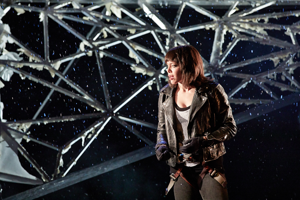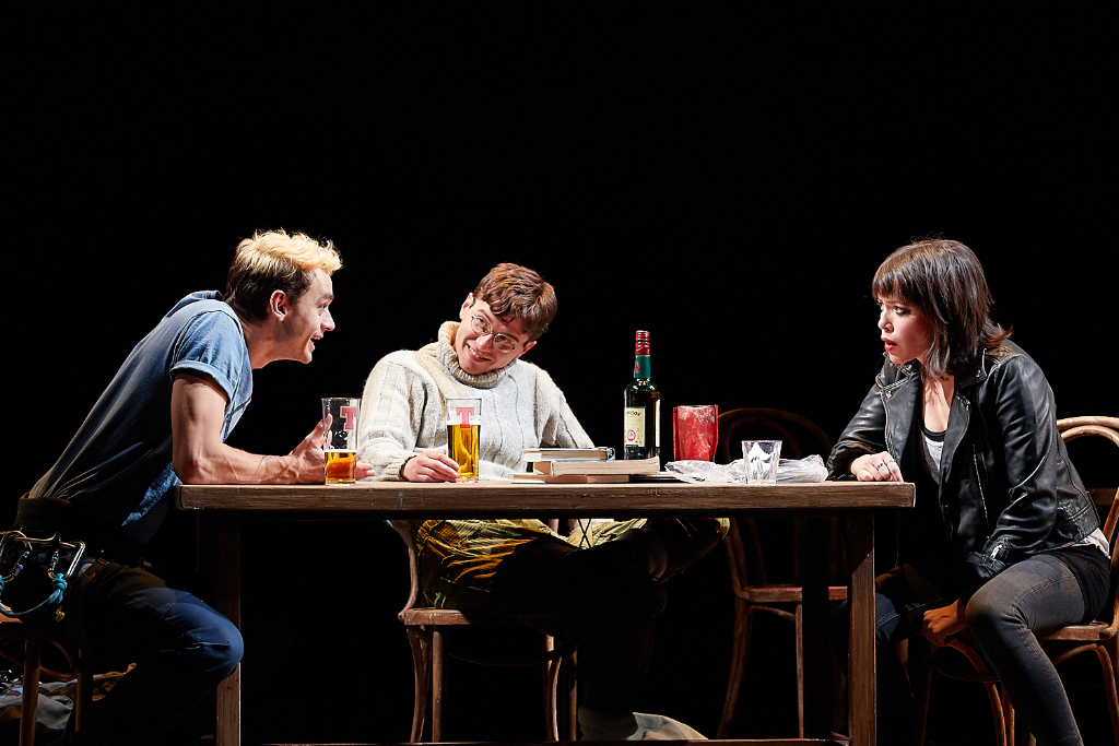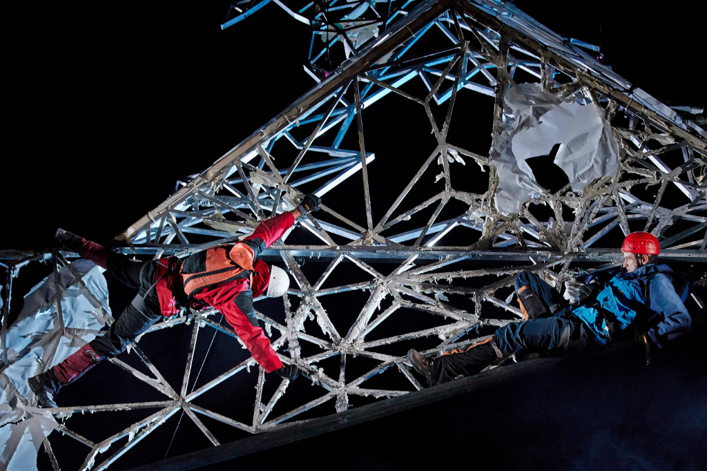 Director Tom Morris was so affected by Joe’s story and so determined to recount it with the immediacy of a theatrical tone that he worked around all the difficulties of representing it on stage with the help of adaptor David Grieg. The extended time of solitude that Joe experiences is dramatised by turning the voice in his head (that Joe writes about in his memoir) into a vision of his sister Sarah, guiding him and sometimes teasing him affectionately. Richard, the backpacker who accompanies the men part of the way, becomes a nerdy aspiring writer who helps Sarah (and the audience) to better understand the basics of climbing.