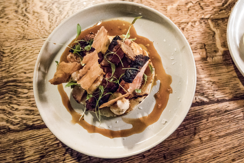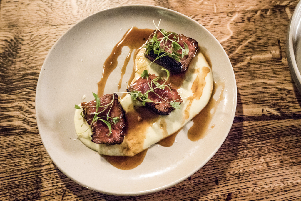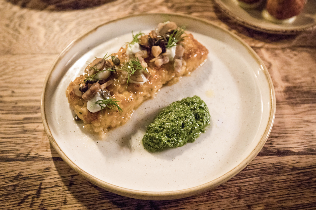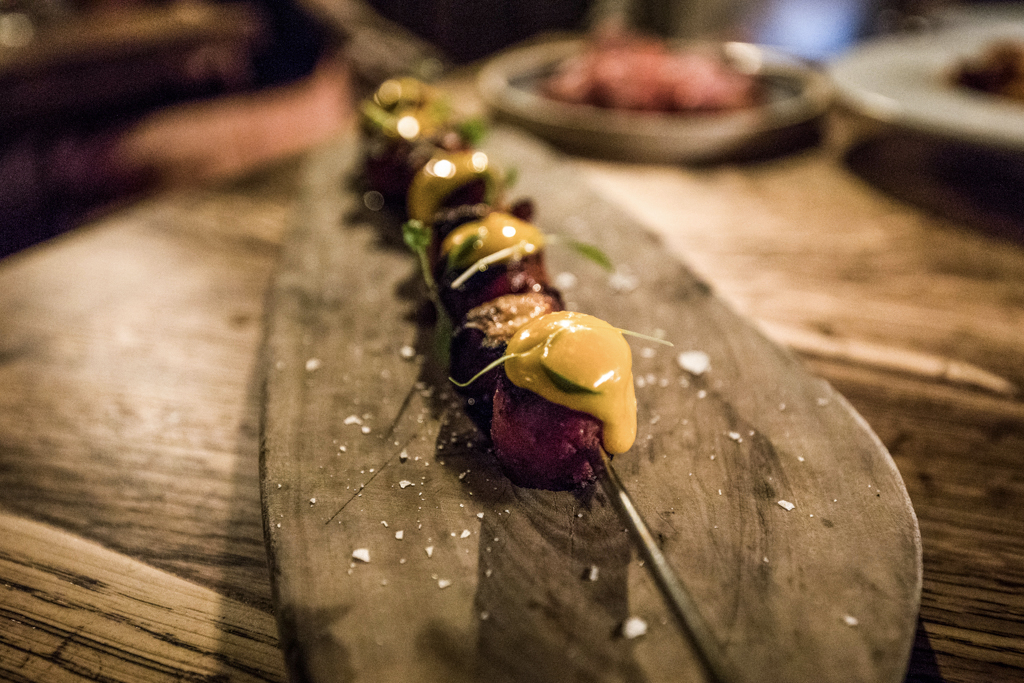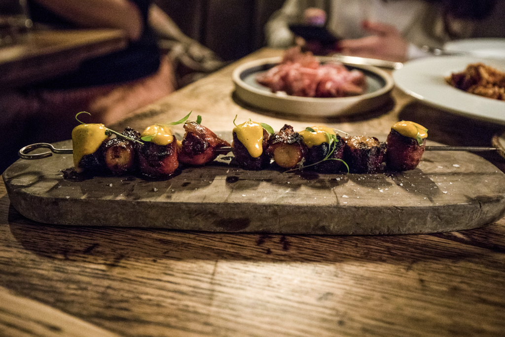 Maintaining an ideal al dente texture, the pumpkin risotto took us by surprise for its softness and nutty taste, which was happily paired with dashes of seed pesto. Once again, though, one of our favourites was a quite straightforward dish. Landing on our table directly from the wood-fired grill upstairs, the Octopus and Chorizo Skewer delivered a succulent sequence of the two elements, the smoked flavour tempered by saffron aioli.