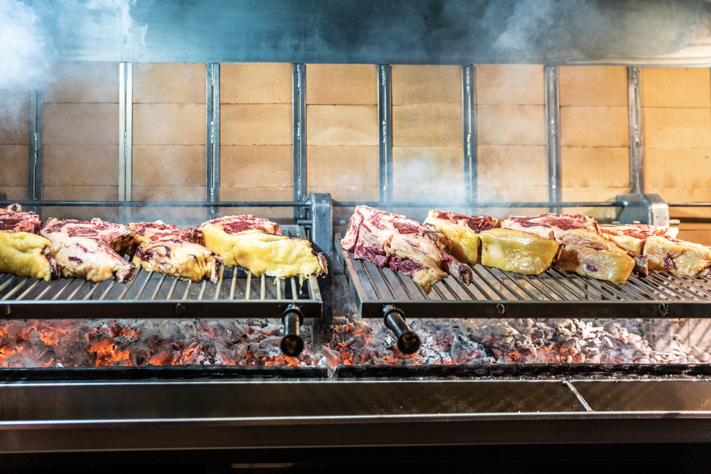 The meat is then cooked on the Basque grill. With its own unique design, this grill is a basic part of prestigious Basque cuisine. The steaks, which range from one to three kilos each, are grilled over oak hardwood to get the hottest coals, with coarse sea salt to seal the meat and let the fat and juices inside confit, in keeping with tradition.