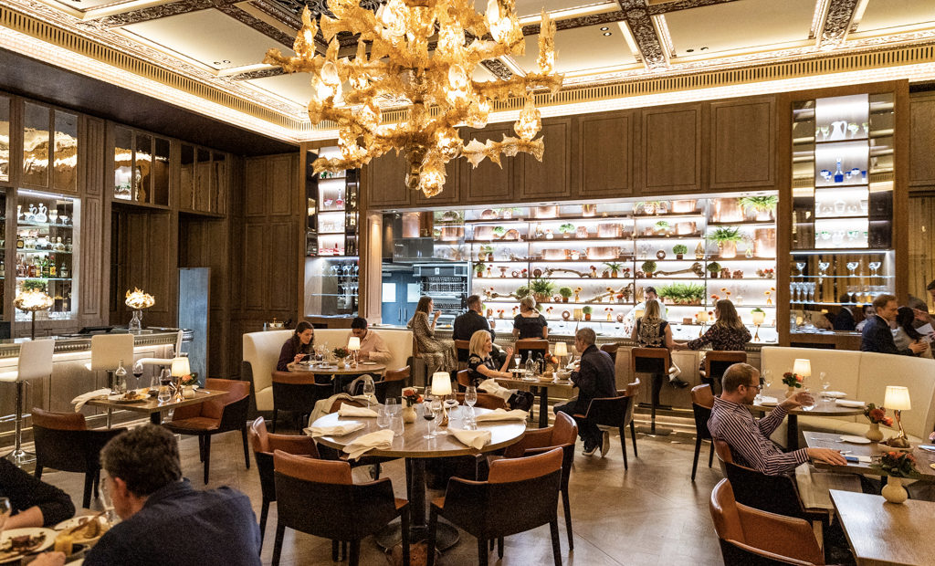 The restaurant has been completely refurbished, giving it a fresh new look but also including details dating back to 1931 such as the gold door and ceiling ornaments. The design is sleek and the atmosphere is relaxed. Most of the materials have a golden shade – or a colour that matches impeccably – to the delight of the wealthy guests of this luxury hotel.