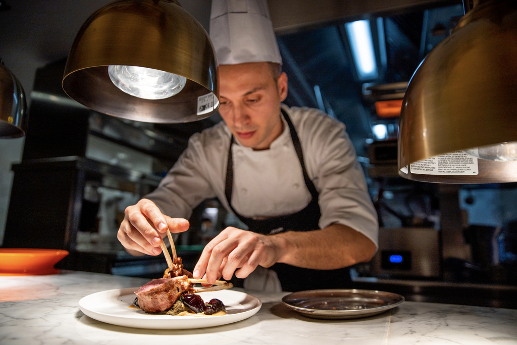 For mains we have a monkfish, cooked on the Josper oven grill, which keeps the fish moist and gives it a smoky flavour. It comes already sliced, making it very easy to share, on top of a clam and friggitelli (sweet chilli pepper) sauce. Then, a rack of lamb shows how the chef not only masters fish and pasta dishes, but also has great understanding of how to cook meat: it’s pink, tender, and accompanied by a delicious tarallo purée with ‘nduja and aubergine. We have it with a glass of nebbiolo Perbacco Vietti 2016. As we dine, we see a Tomahawk steak passing by, along with a veal Milanese and thin-crust pizzas: all these plates really make us want to come back for more.