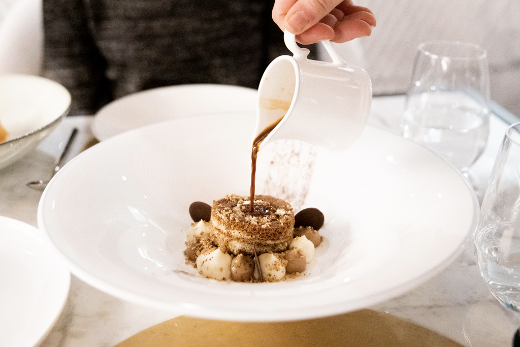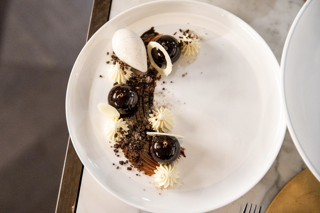 There are eight desserts on the menu. It’s so difficult to choose that we decide to have three. A tiramisù gets a contemporary reimagining, the coffee poured on top of a chocolatey sponge, with drops of chocolate and mascarpone surrounding it. The chocolate profiterole is the more refined of the dishes, but the must-have is certainly the babà. This classic Neapolitan pudding is airy and very light on liquor: you can just dig in without feeling overpowered.
