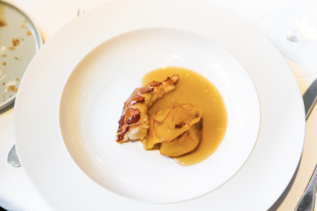 With bread and butter comes a surprise: raw scallop with apple slices accompanied by a scallop consommé, and also special butter covered by a reduction of the latter. Everything is quite delicious on its own, although the intensity of the clear broth and the freshness of the scallops did not come together.