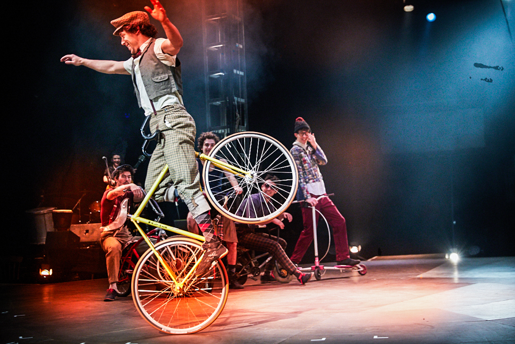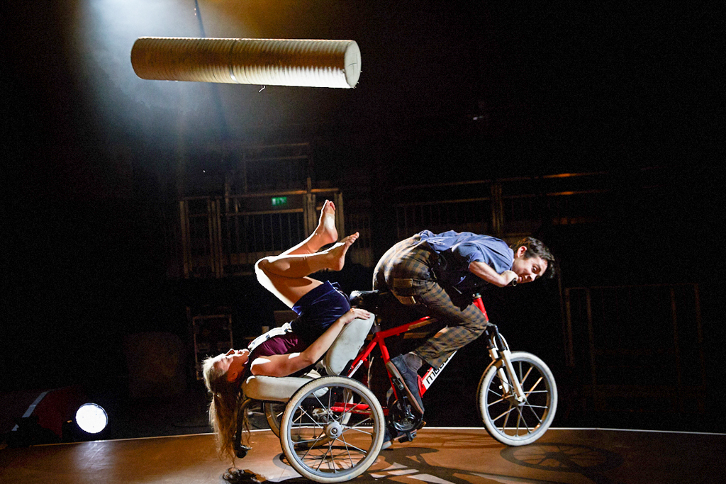 And this is what NoFit State provides – true escapism. Over the course of the performance, energetic childhood playtime on bikes, trikes, scooters and the rest is juxtaposed with all the more captivating, darker narratives. The absence of a storyline is not noticed, as a brooding figure flitting his way across a tightrope high above (Ellis Grover) and an angry bride-type, ascending forcefully towards the sky (Rosa-Marie Schmid), are soon replaced by an endearing globe walker (Davide Salodini) and a suave unicyclist (Sam Goodburn).