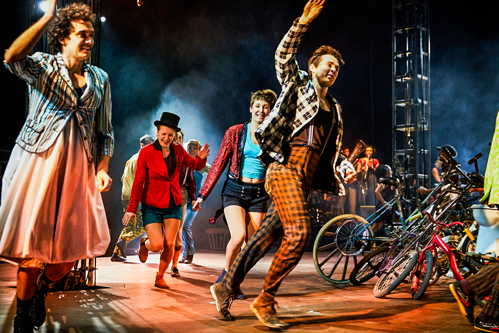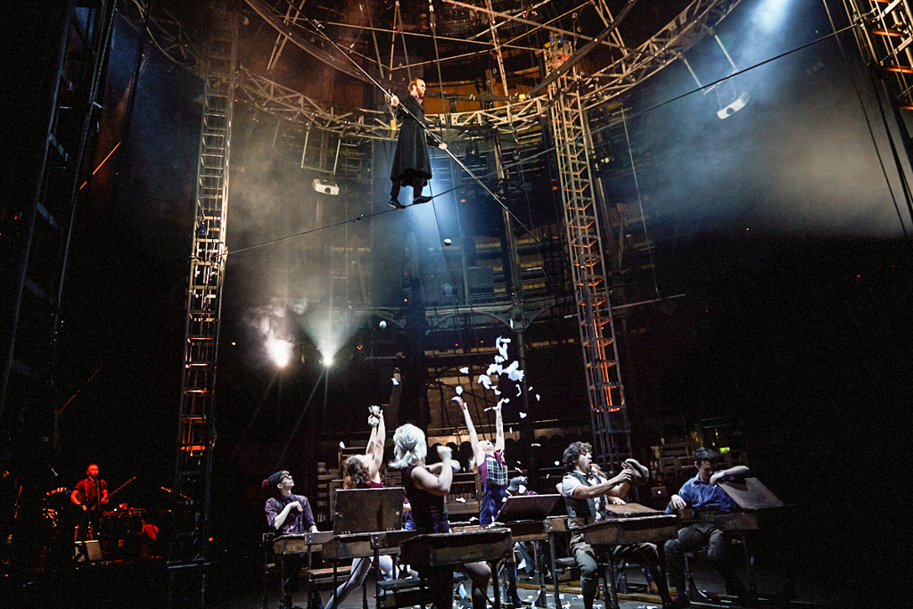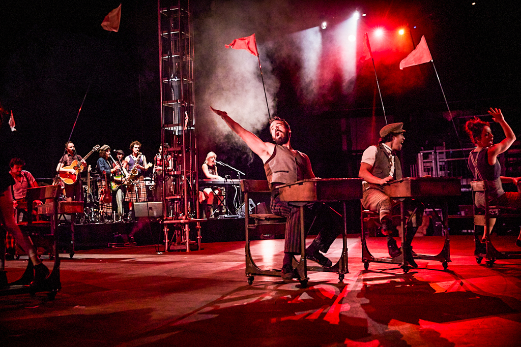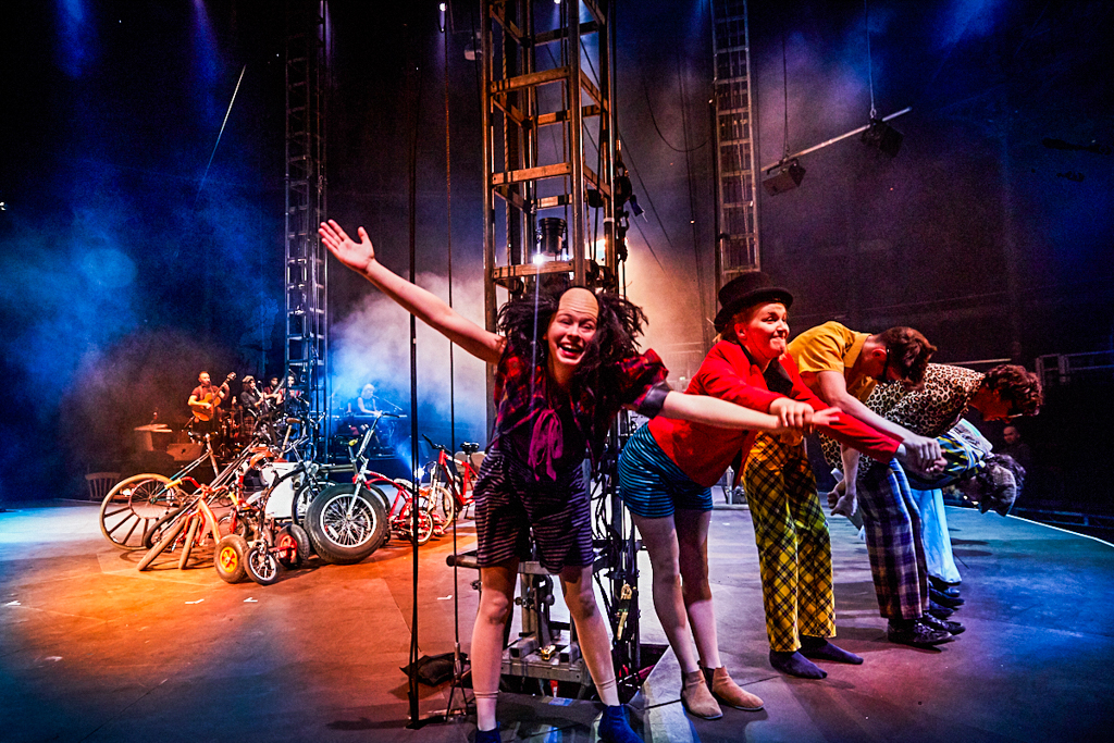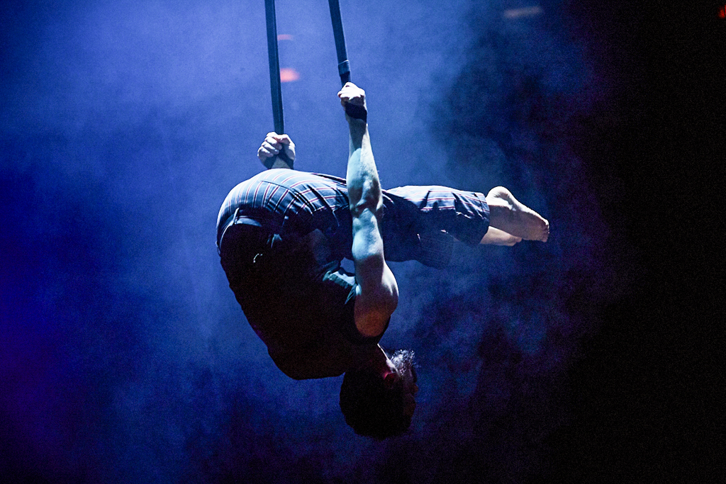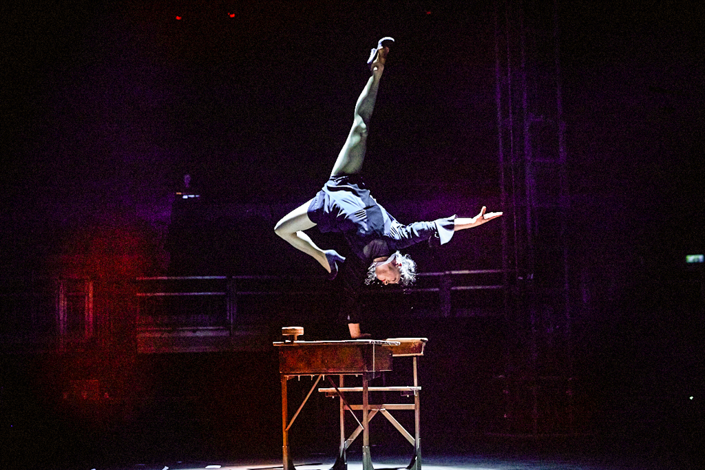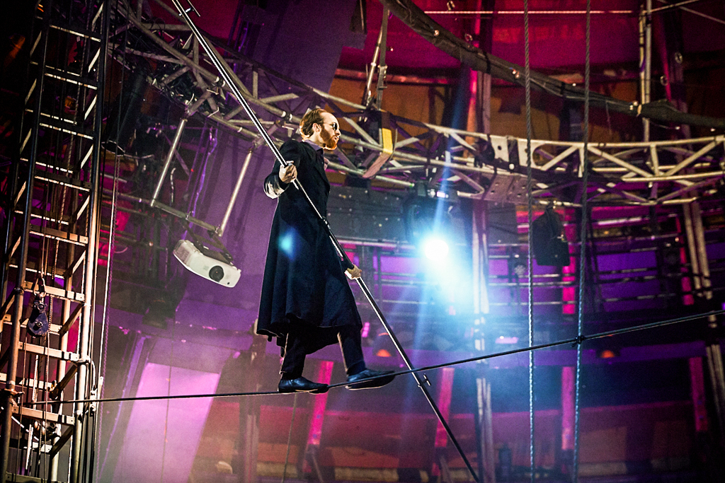 The lofty ceilings of Camden’s Roundhouse have been transformed into an intimate space in more ways than one by the jubilant anarchy taking place. As the performers fly about on stage, the riggers negotiate their way around the beams and the live band warp the atmosphere of the room, you find yourself wishing for more pairs of eyes to watch it all unfold. Every movement by every performer in this show is perfect artistry and completely fascinating, the ensemble pushing the boundaries between real and imaginary.