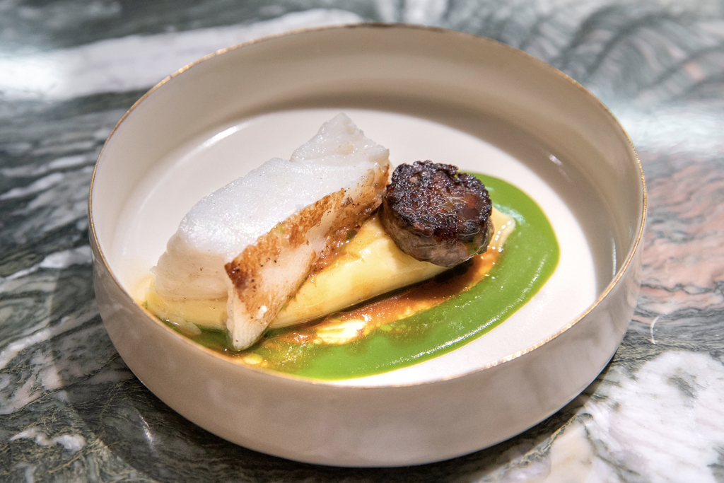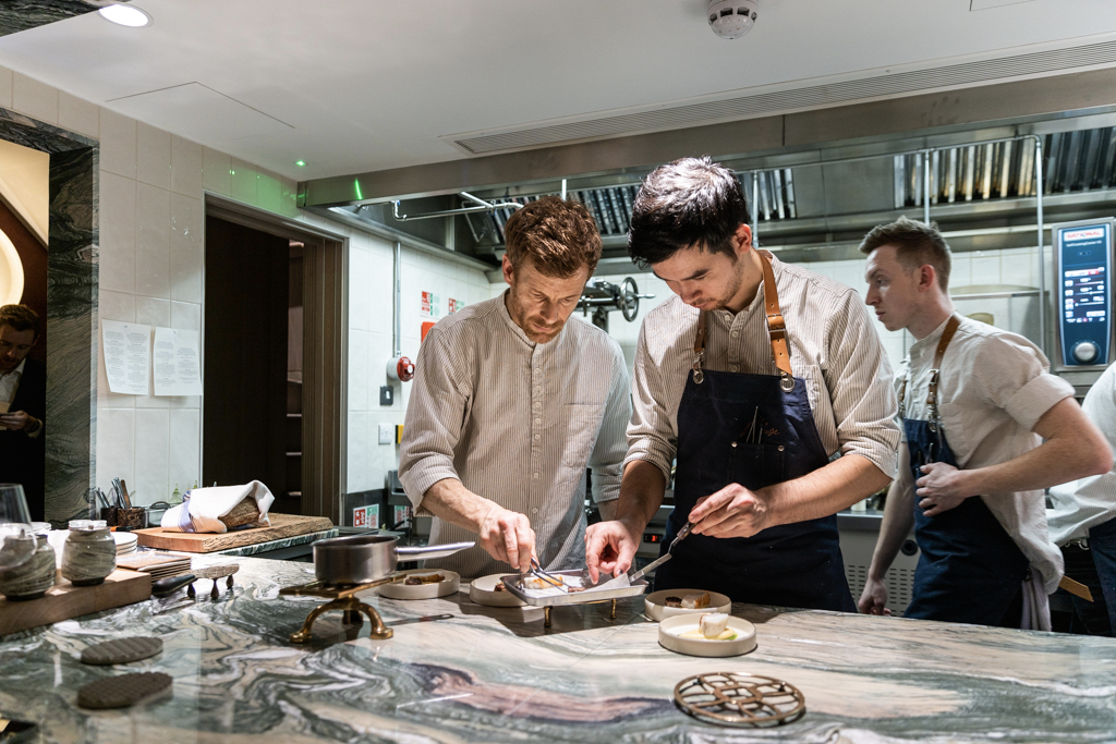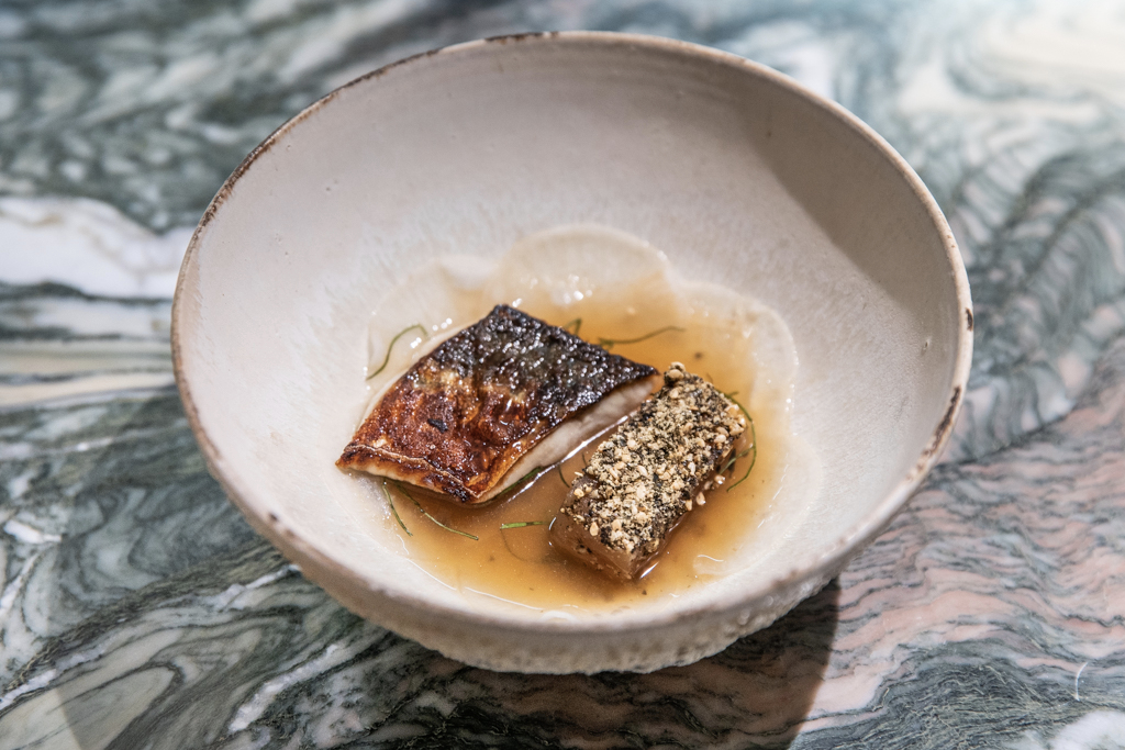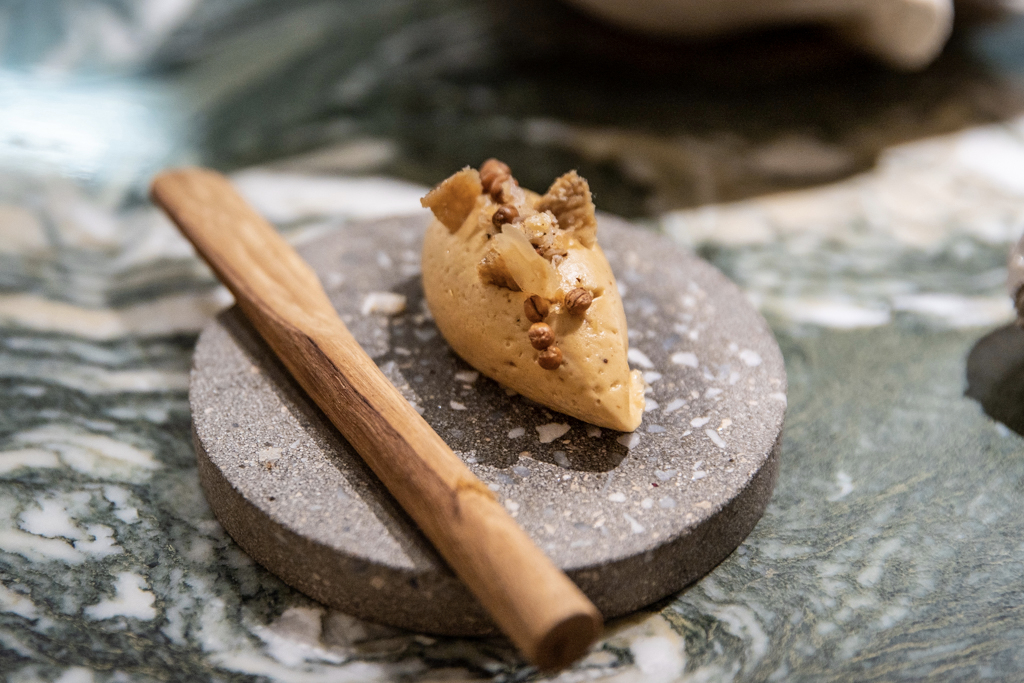 Each dish comes on a different plate, mostly earthenware or handmade. Glasses are of the best kind, Zalto. A venison tartare is too little to fully enjoy, but the rest of the snacks – with chestnut, mushroom and cheese – make up for this. The first course, Just Down the Road, celebrates Aikens’s roots in Norfolk, where Old Hall Farm provides them with the milk used to produce a ricotta completed with burnt shallots, honey and black truffle. Sourdough bread, made from three different grains (barley, wheat and malted wheat flakes; one of which is milled on site), is served with two different kinds of butter: unpasteurised and chicken.