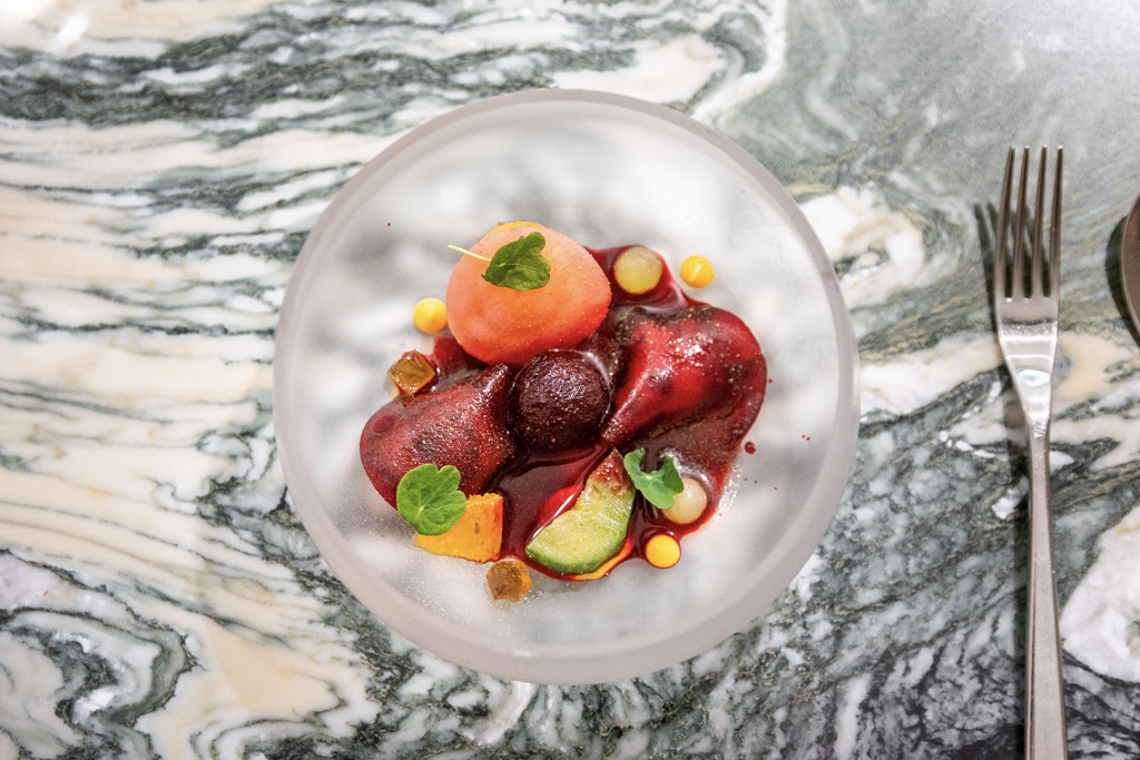 Sea Lavender is the name of the boat that the chef’s father used in Devon to catch mackerel, a fish Aikens initially disliked. Here it comes with daikon and a delicious broth, a testament to his change of heart towards it. The Essence wants to celebrate a single ingredient, in this case beetroot, which they proudly source from Bagthorpe Farm, again in Norfolk. Three kinds of beetroot, in different shapes and forms – also yoghurt – turn the spotlight on this vegetable, with the help of fermented cucumber and orange purée. It’s a technical course but the flavours are the real drive. Conquering the Beech Tree is arguably Muse’s more complex dish. For the chef, it represents challenging himself (they will tell you about when he used to climb a copper beech tree as a child), but I don’t see this as a daring plate, it’s just very good: a langoustine, cooked with lardo di colonnata and served in a crystal-clear apple broth, made from Granny Smith (acidic) and Pink Lady (sweet) varieties.