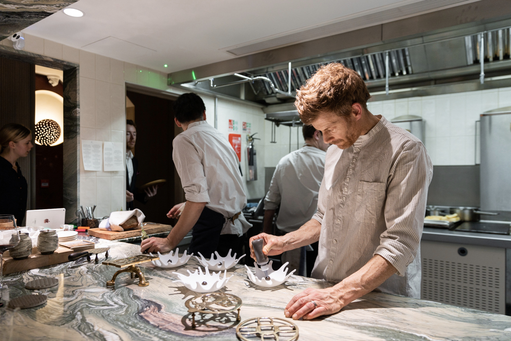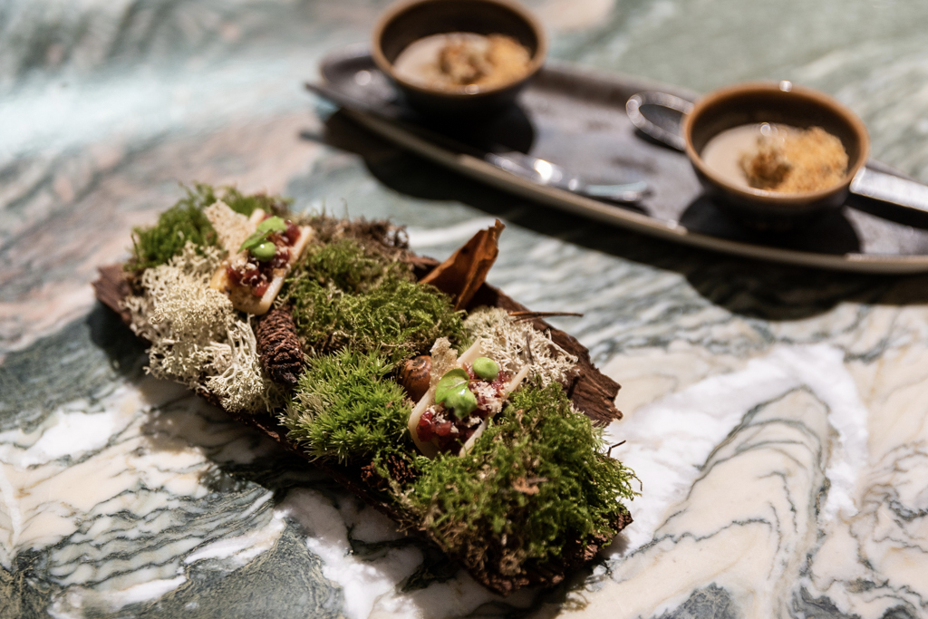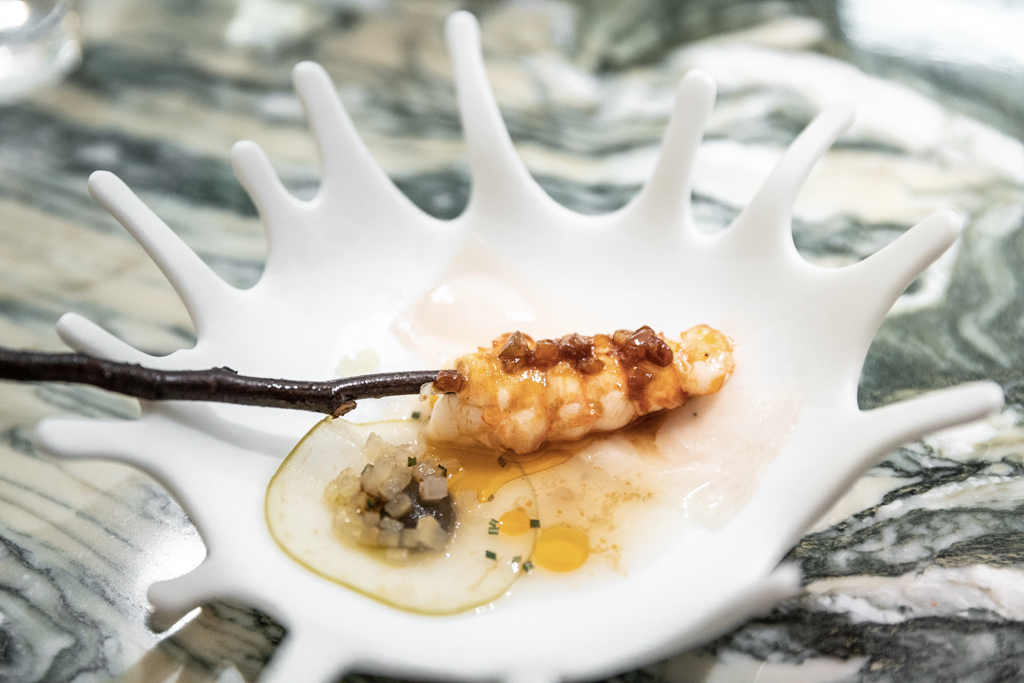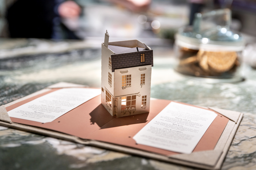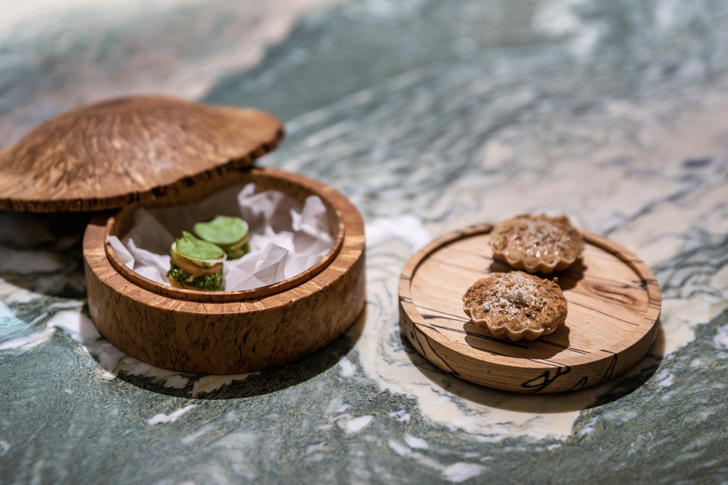 It feels intimate and exclusive. It must not be easy for a temperamental chef to be working right in front of his guests, with no filter: a continuous exercise in self-control and discreet whispering. The menu opens like a pop-up storybook for kids, recreating the building’s shape in a very charming (and Instagrammable) fashion. It’s set, with the option of either six (£95) or ten (£145) courses. The price point is quite high, but it’s mostly justified by the personal nature of the experience.