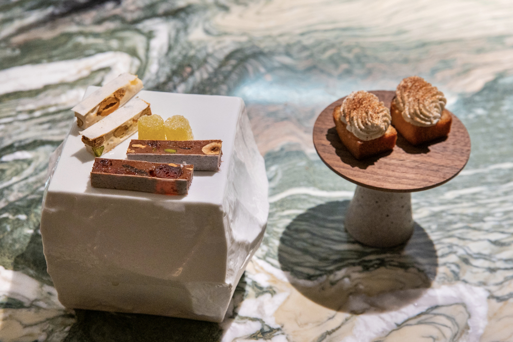 If you pass by without knowing there’s a restaurant there, you won’t notice it. A glossy black door bears no sign or name. The windows are half covered, the lights warm and soft. Stepping in, you enter a tiny house decorated in pink and beige palettes. It resembles a posh tea house. On the ground floor there’s the bar-cum-dessert kitchen, with a big marble counter where diners can enjoy their meal, and also a few seats to sip cocktails and liquors. Upstairs, a cosy dining room hosts 20 guests, including another marbled counter, shared with the restaurant’s kitchen.