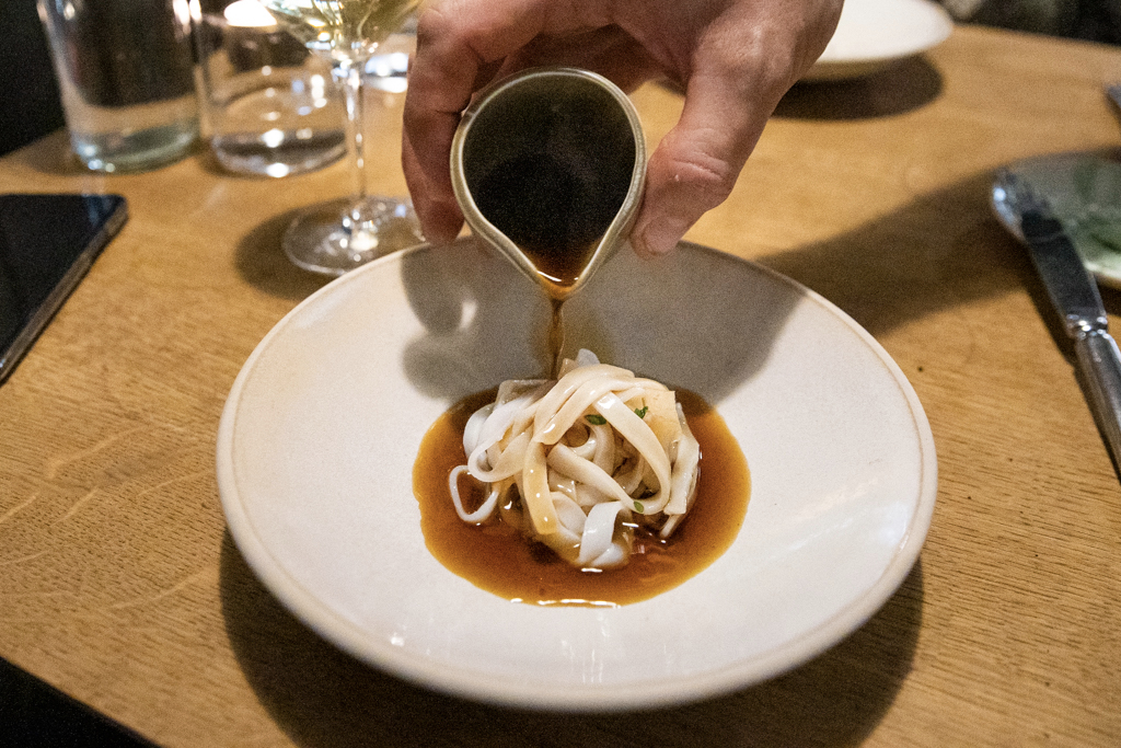 Each dish’s wine pairing was thoughtfully designed by the Fiskebar staff, and the waiters were well-briefed about the offerings. The most balanced pairing was between a Kattegat brill with smoked mussels and seaweed and a Grüner Veltliner from M & A Andorfer in Austria. The raw squid with chicken wing dashi and kohlrabi proved another highlight.