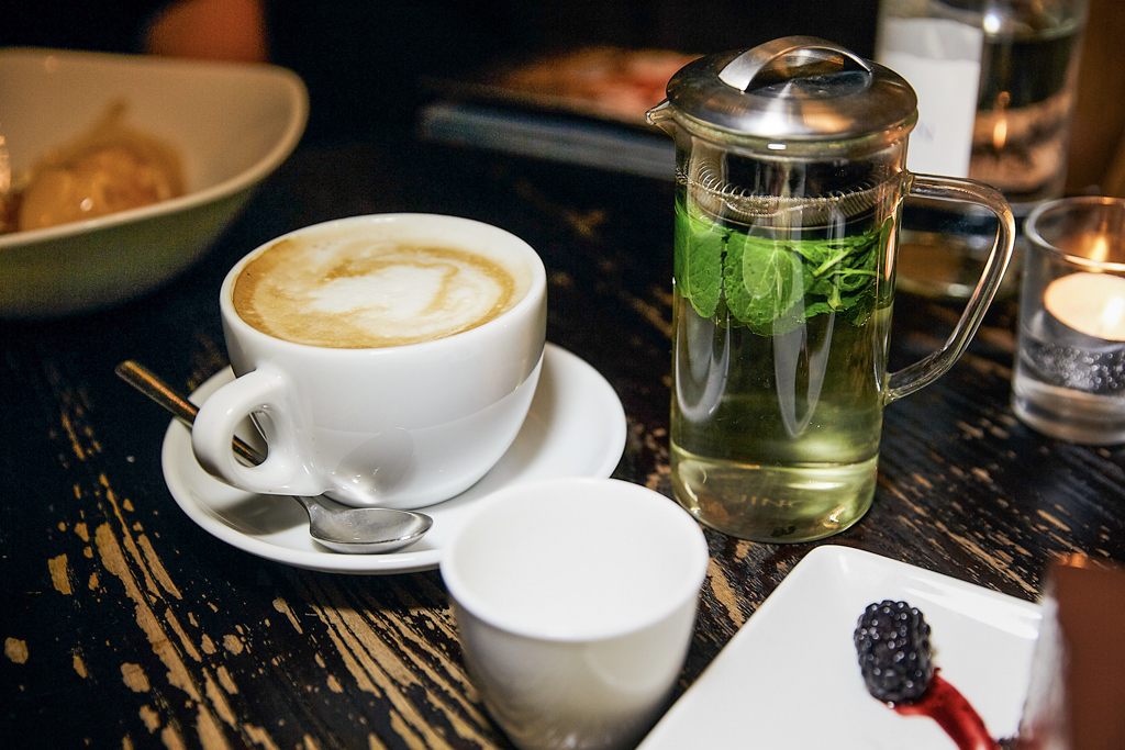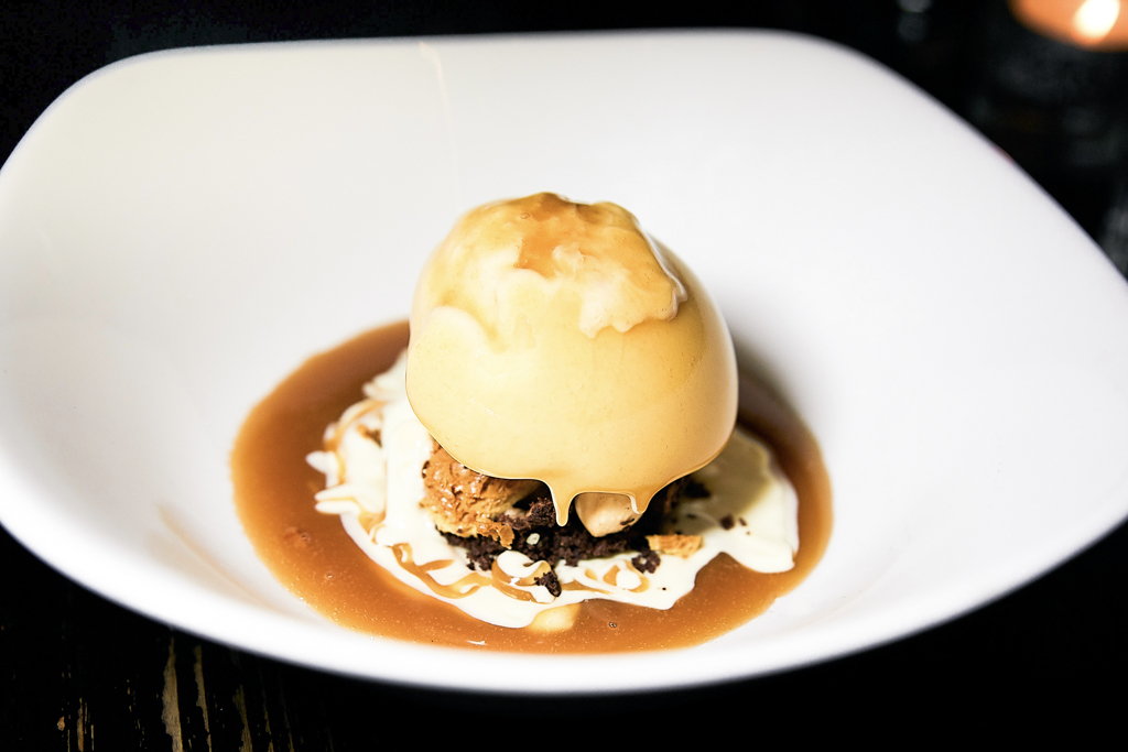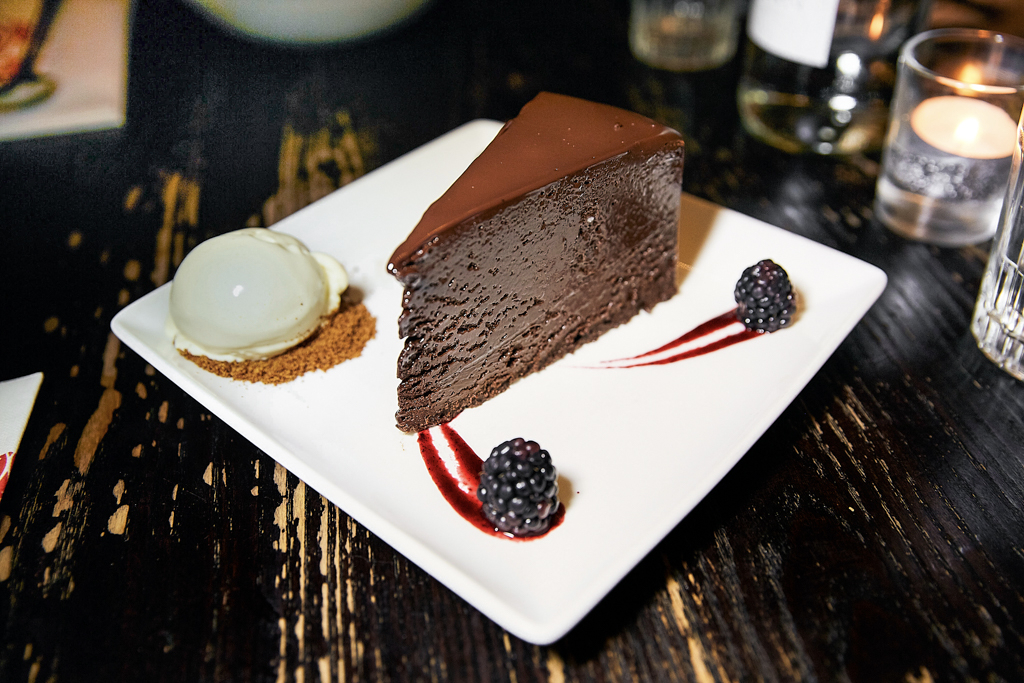 For dessert, we opted for the show-stopping white chocolate bombe filled with sickly pieces of honeycomb. The waitress poured over warming toffee sauce whilst we grabbed our camera phones and watched the chocolate slowly disintegrate. The chocolate flourless mousse cake was made to share and needed the vanilla ice cream and sprinkle of blackberries to mute all that gooey richness.