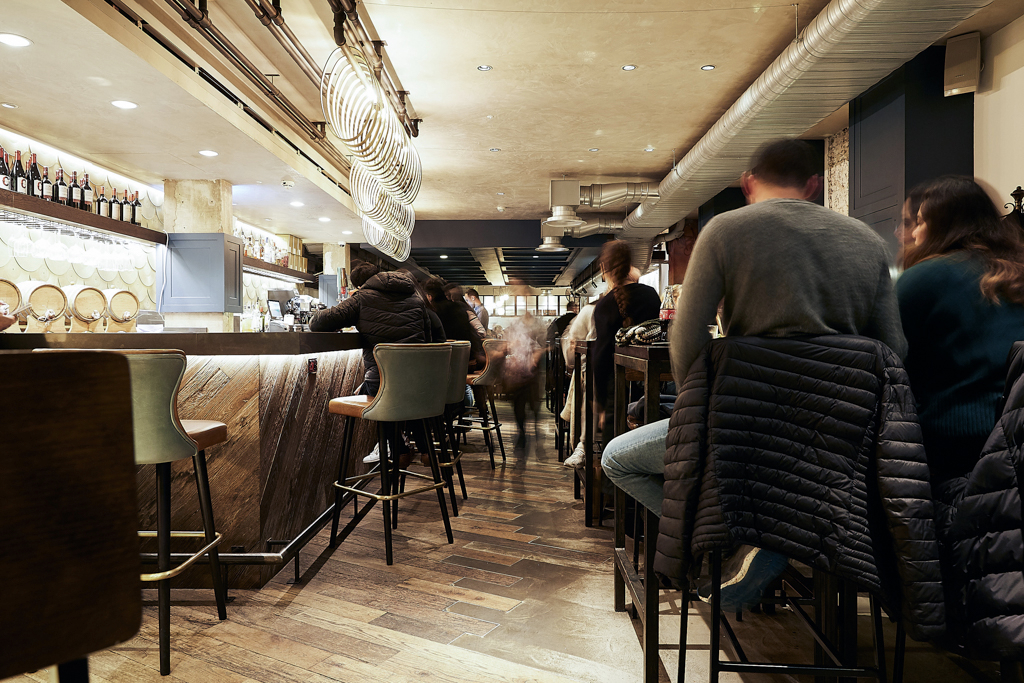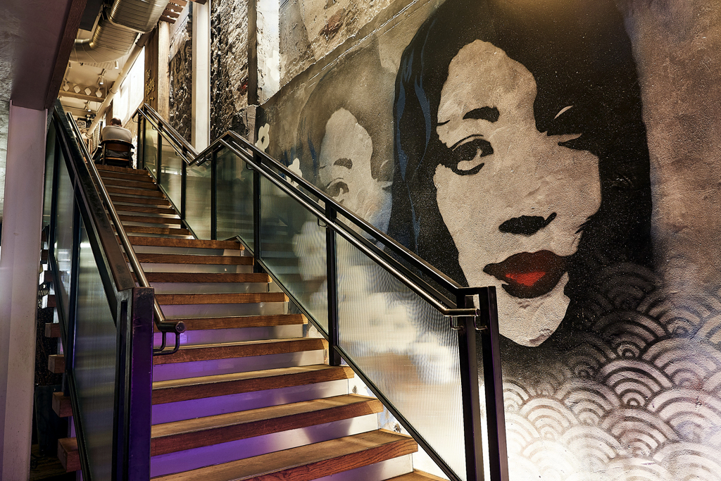 Slick black awnings and smart signage mark our arrival. We are welcomed into an enormous dining room with a bar flanked by stools and higher sharing tables nearer the front. Lower seating dominates the space further in, as does the open kitchen. Provocative murals appear on the whitewashed brick walls, with stairs leading down to The Pastry Lab, where the desserts are created in-house, the space often used for special events.