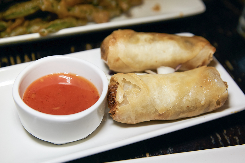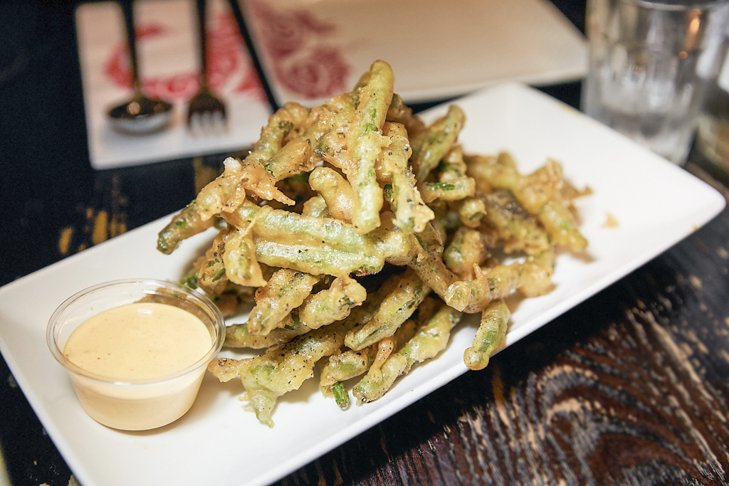 For an early Monday dinner, the place is heaving with an eclectic mix of birthday parties, dates and after-work dinners. We start our own festivities with two of their speciality cocktails. Luck + Fortune blends a savoury fusion of gin and Thai basil over mandarin liquor, while Miyamoto with Ginsing and grapefruit is zesty and refreshing. Both work well alongside our choice of starters: homemade vegetable spring rolls plumped up with julienne vegetables and a delicious sweet chilli sauce followed by a crispy stack of tempura green beans paired with creamy aioli.