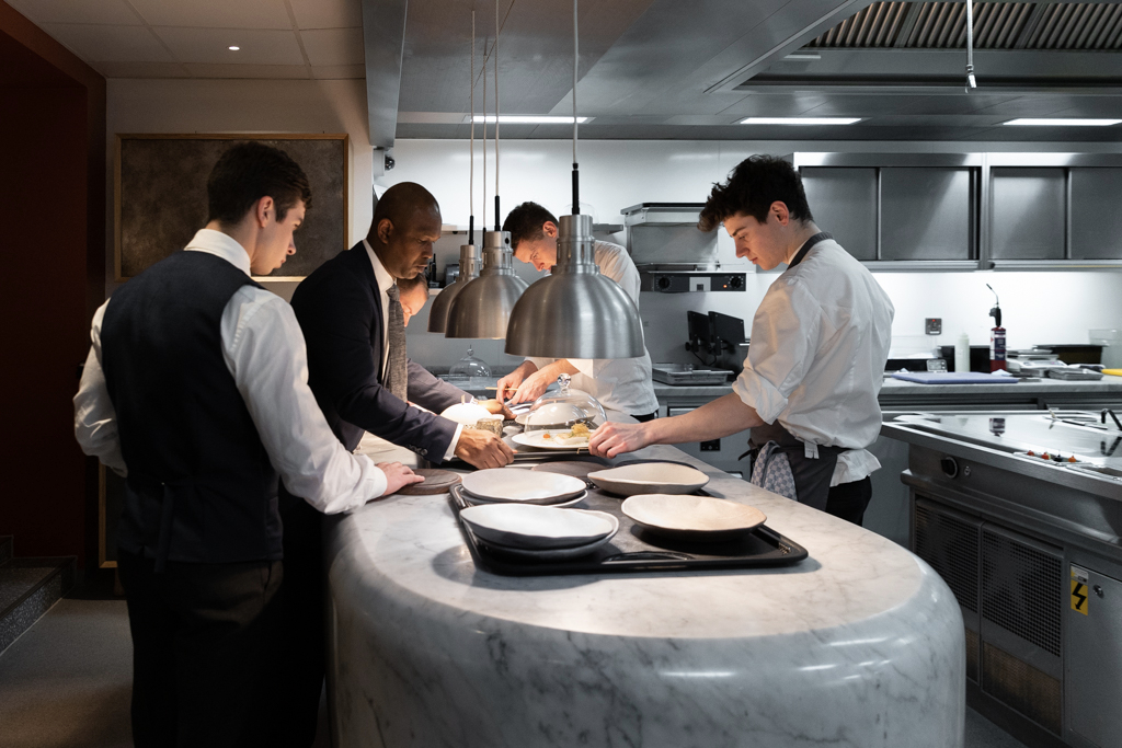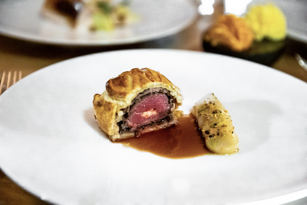 The best dish is yet to come: Welsh venison en croûte – Wellington style, foie gras inside – with turnip, honey and whisky. It’s delectable and wonderfully cooked. The pairing with Brunello di Montalcino from Il Marroneto works very well. We also try the delicious Guinea Fowl, which comes from Tousin in France.