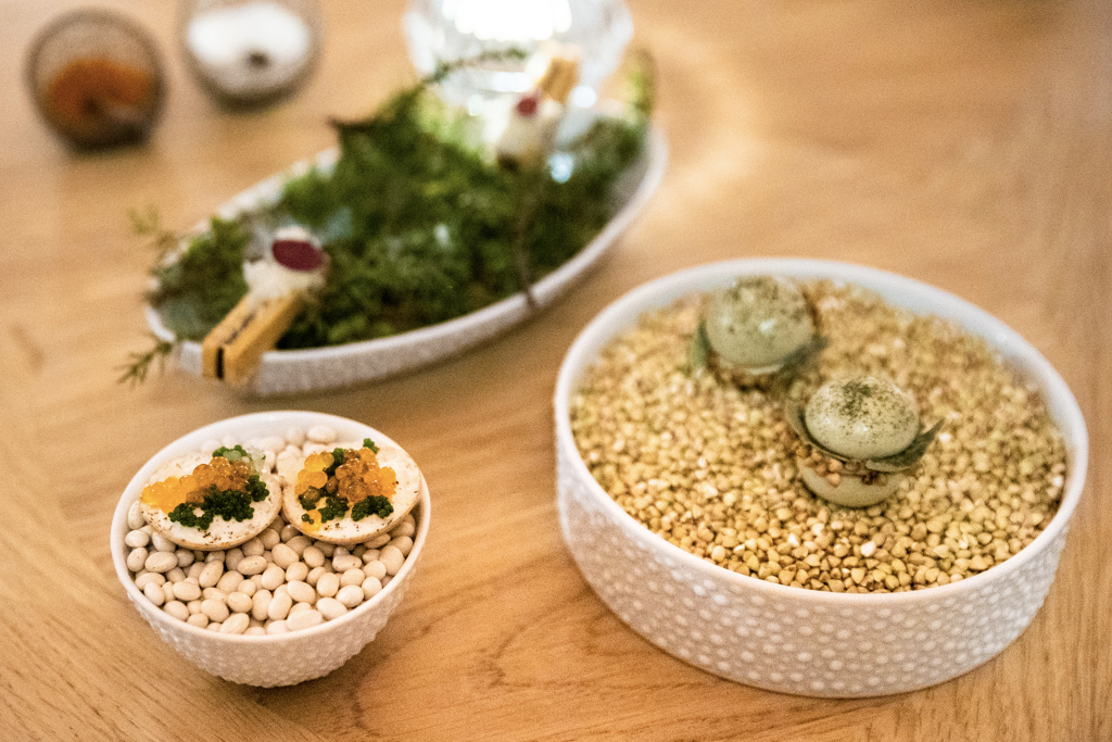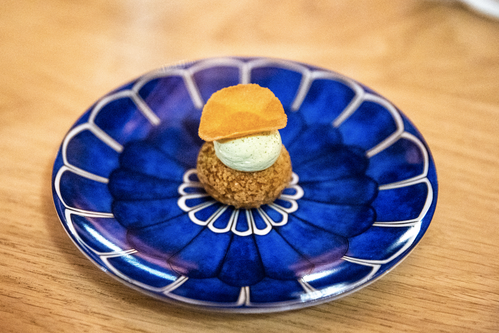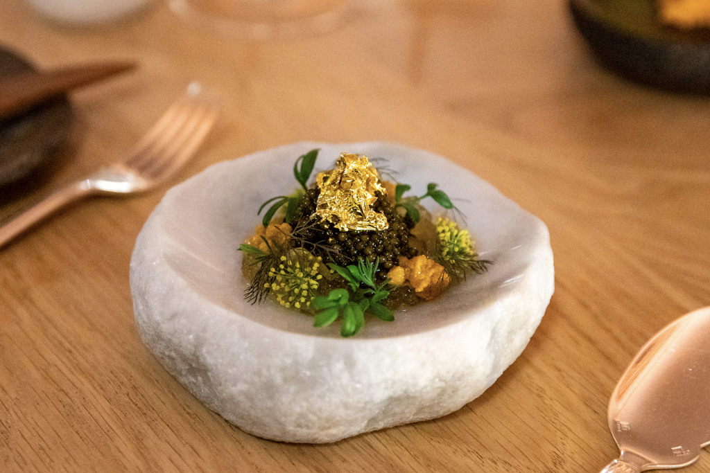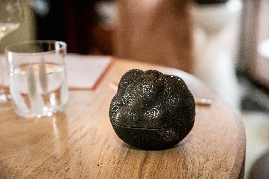 The dish we begin with is Caviar, where the Iranian sturgeon’s roe is combined with oyster, dashi gel and sea urchin. And gold on top, because why not? The result is a balanced triumph of sapid flavours, which the wine pairing perfectly matches: a Nikolaihof Wachau Gruner Veltliner Cabinet Trocken 1985. We continue with Black Truffle, one of Harroze’s most iconic creations. This French polenta called escaoutoun rose to fame in 2003 after being featured in the New York Times; it’s velvety, creamy (she adds a hard Basque sheep’s cheese called Ardi Gasna), setting the stage for the main produce: the black truffle from Périgord, with an egg yolk in the middle. The glass of Riesling Cuvée Fédéric Emile 2008 from Trimbach is yet another proof of wise matching.