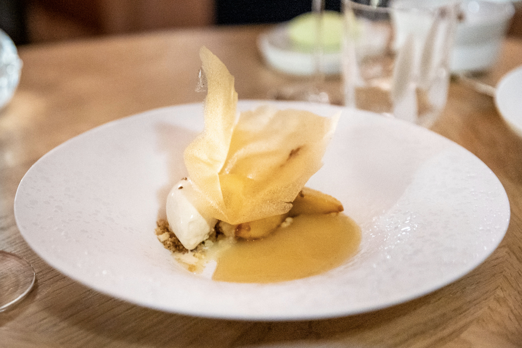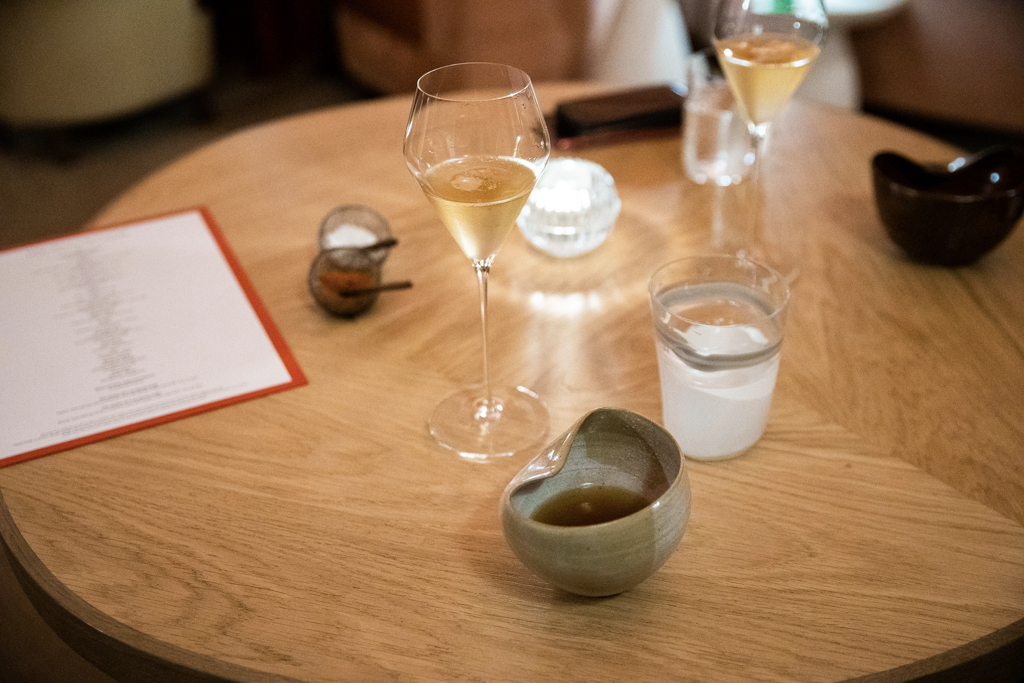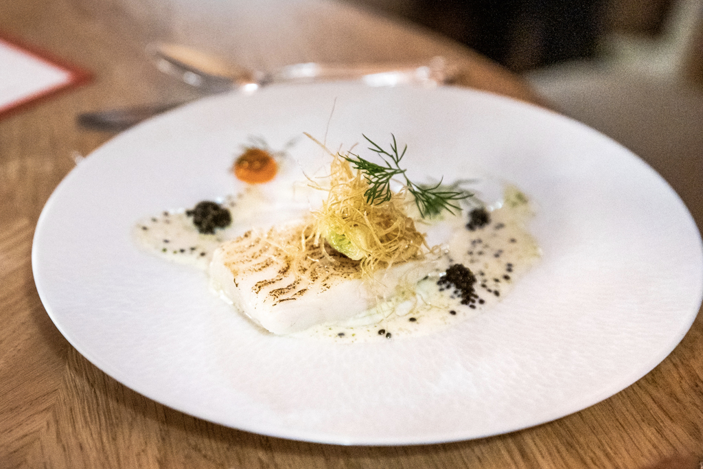 The menu is a one-page list of dishes (15), without the classic separation between starters, mains and desserts (although it’s quite easy to work out the nature and weight of each course). There’s a choice of five (£120) or seven (£170), with the option of going also for either a standard or premium wine pairing.