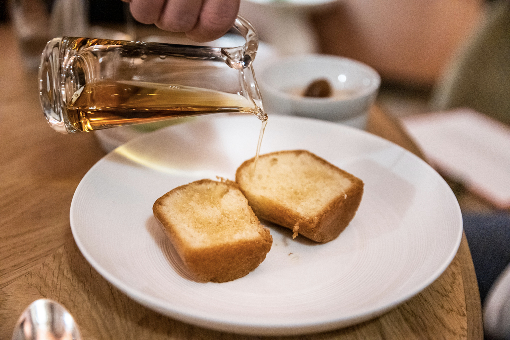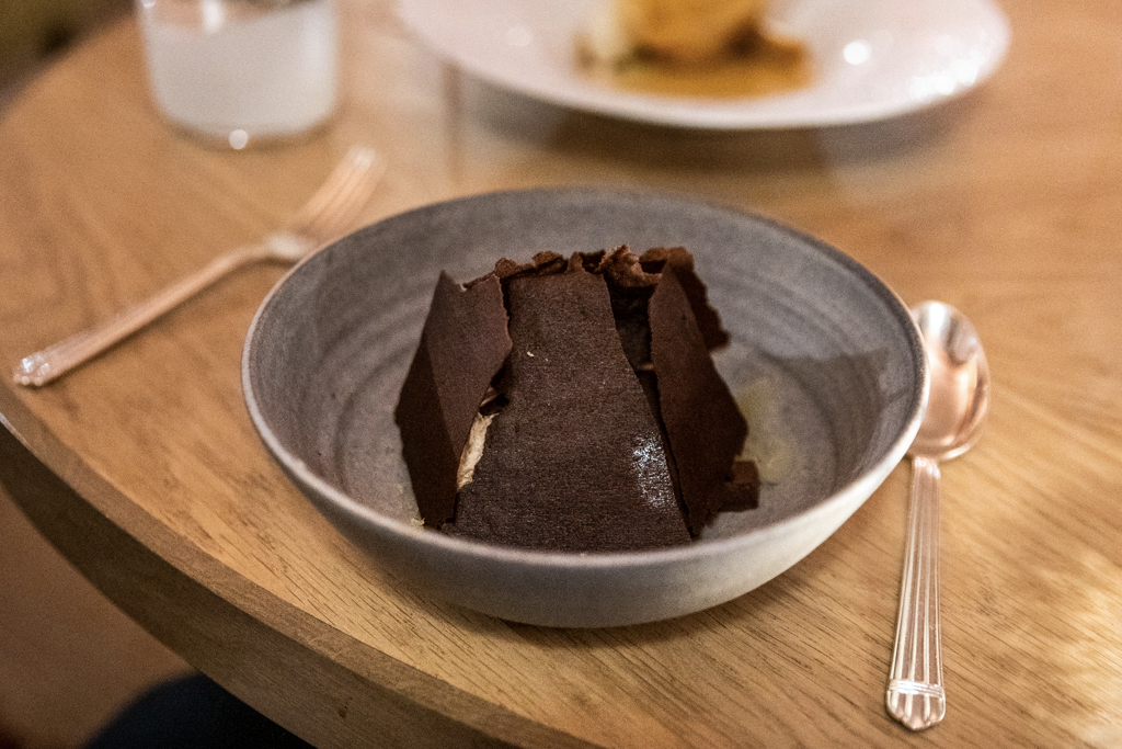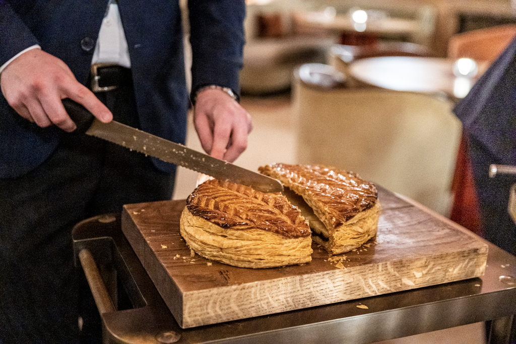 Pear is the first of our desserts, but Darroze’s Signature Baba is the must have. The chef’s family produces armagnac and you’ll be given the option to pick your preferred vintage – 1995, 2000 or 2005 – before they pour it over the cake (instead of the classic rum). It simply works wonders. As if it wasn’t enough, we taste the Chocolate – of Brazilian origin – pudding, made with Earl Grey tea and bergamot. It’s complex and mouth-filling. And because it’s galette de rois season, instead of the petits-fours we have a nice slice of this, cut in front of us, fresh from the oven.