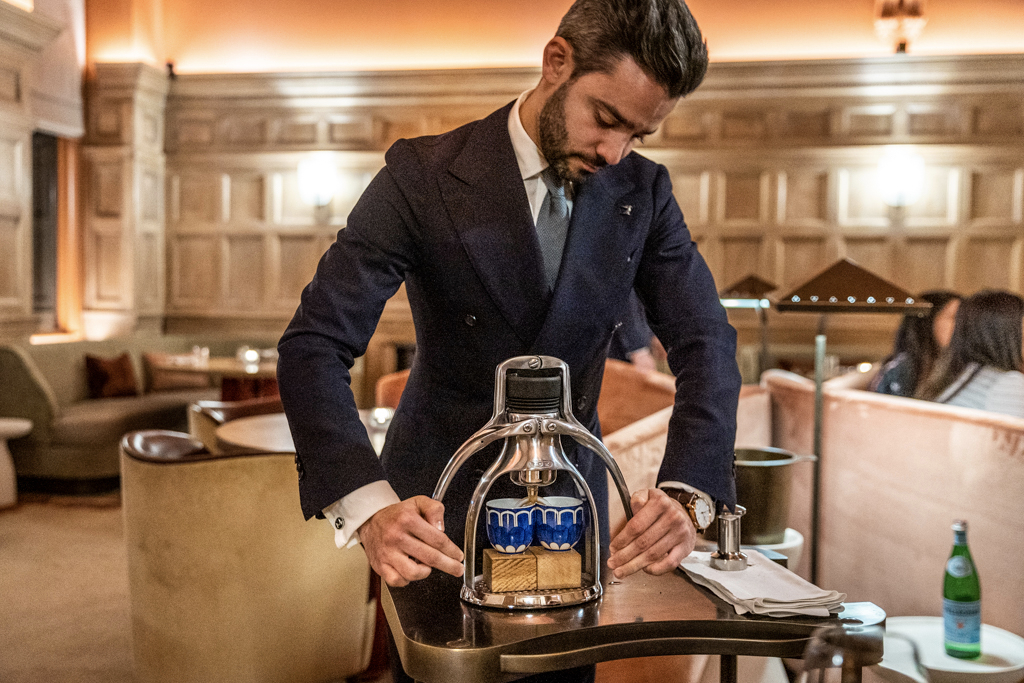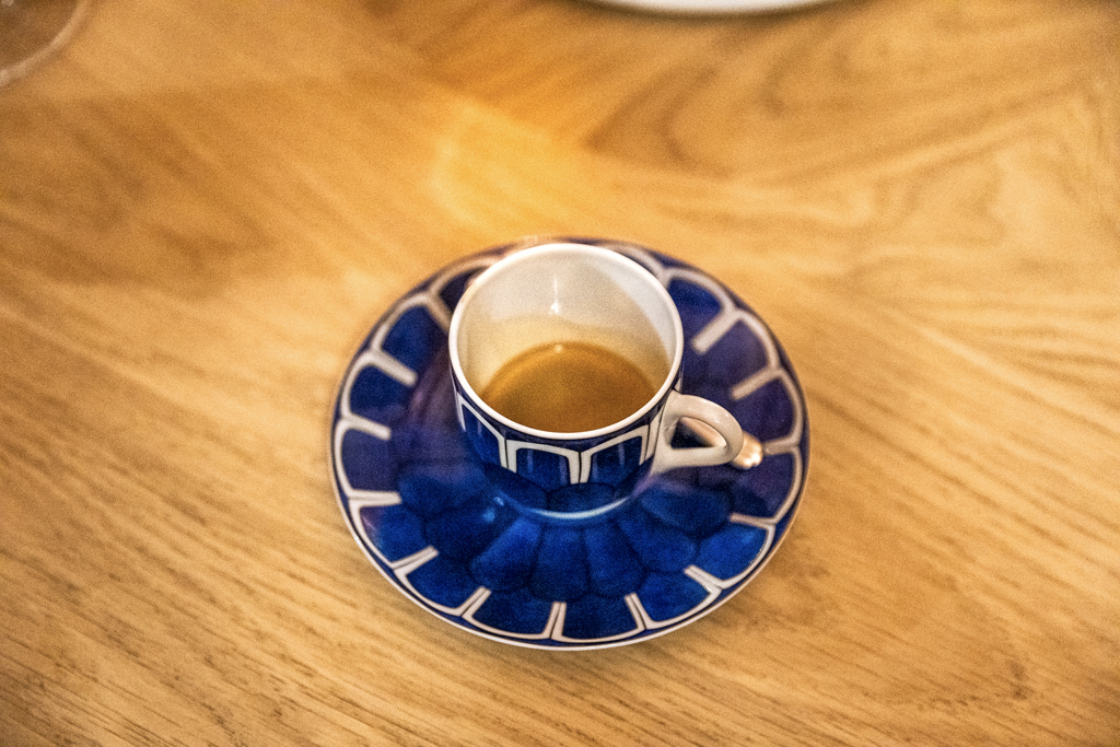 Instead of using an espresso machine, the staff employs a manual press – very theatrical – of the same kind as the one used at restaurant Geranium in Copenaghen. It takes a lot of physical effort but I have to say that the coffee coming out of it – and served in beautiful Hermes china Bleu D’Ailleurs – is very good.