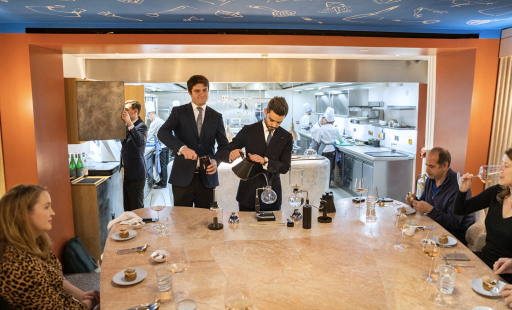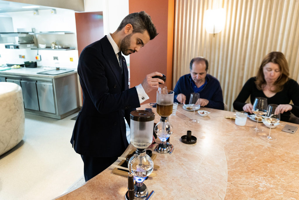 Two-Michelin-starred Hélène Darroze at the Connaught have recently refurbished the restaurant and the brand new chef’s table is impressive: a dramatic pink marble piece set on a Terrazzo dais so that guests sit opposite the kitchen from a higher position. It feels like the dress circle of a theatre, the service a spectacle to watch.