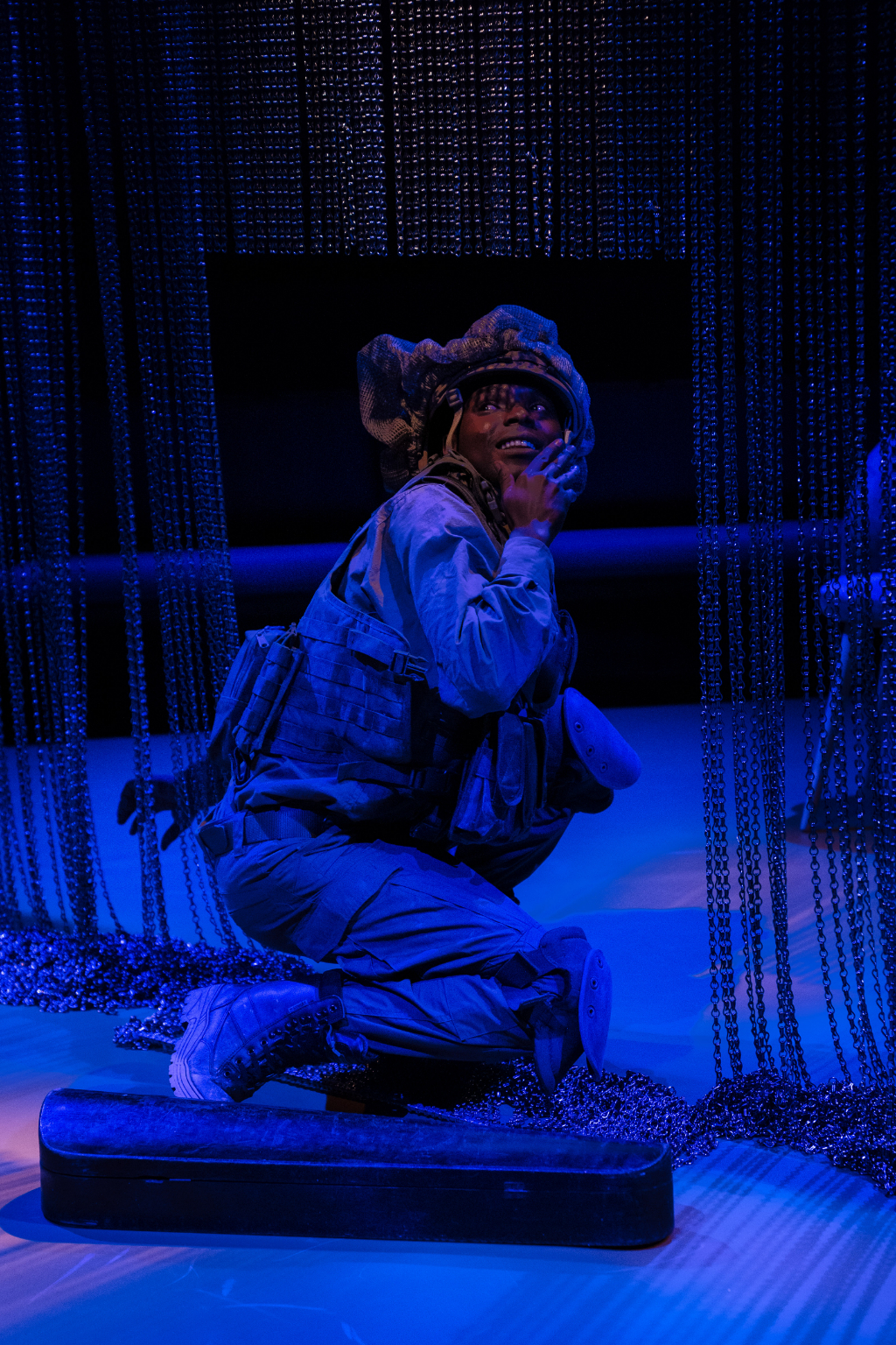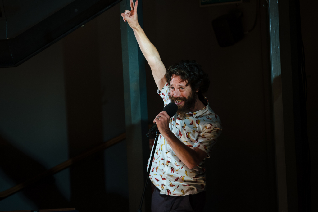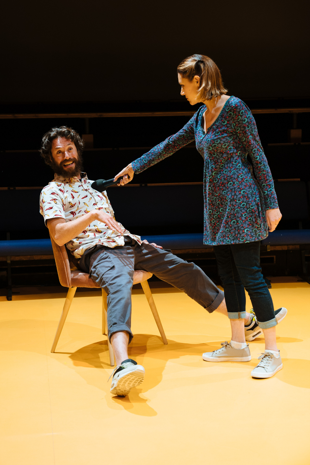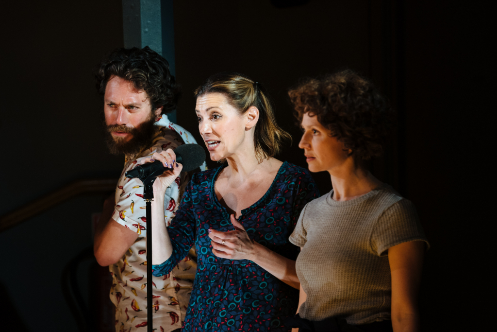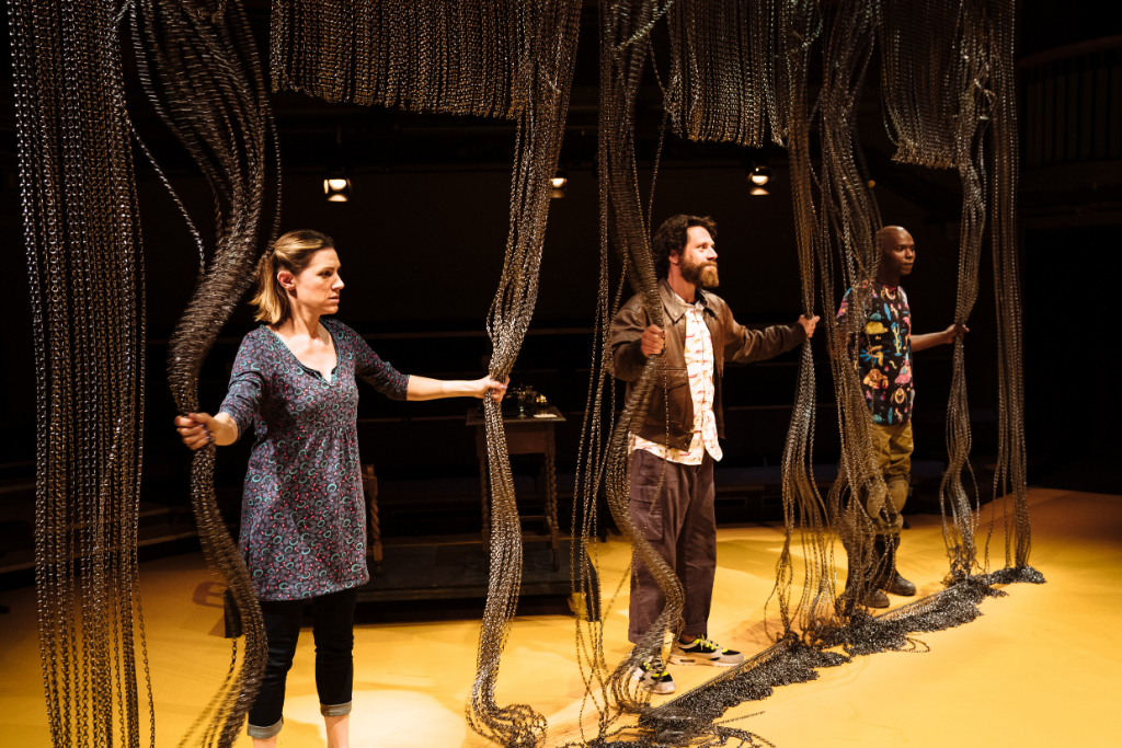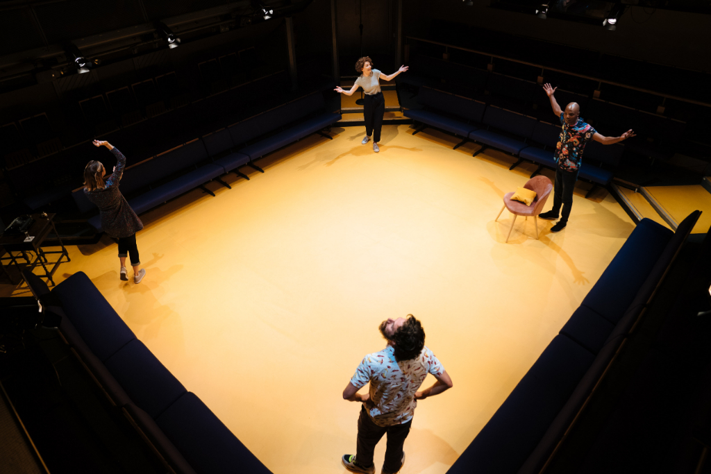 Matthew Xia’s UK production at the Orange Tree Theatre Richmond (in collaboration with The Actors’ Touring Company and Theatre Royal Plymouth) complements Yasur’s script in its defiance of anything too concretely conventional or periodised. Huddled in the round, Naomi Kuyck-Cohen’s minimalist set brings the audience and four performers (Daniel Abelson, Fiston Barek, Michal Horowicz, Hara Yannas) together in a shared informal, imaginative space in which the intimate and unfamiliar are evoked.