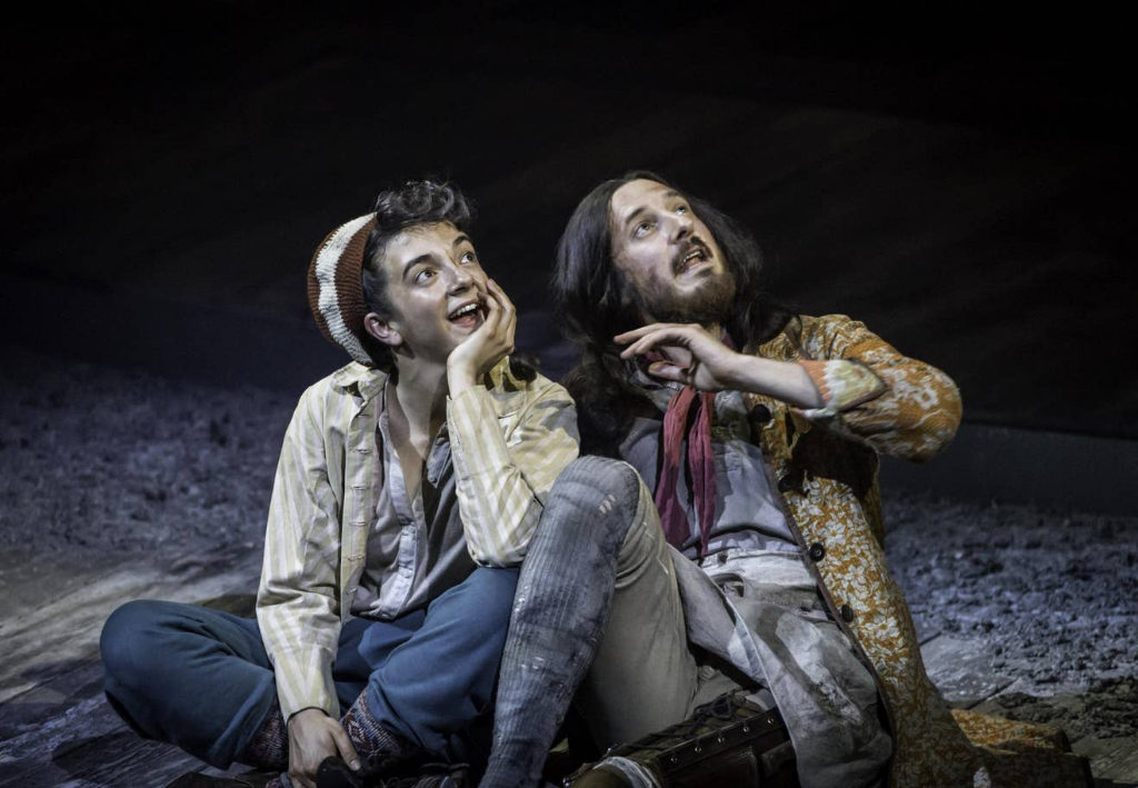 Ferran plays Jim as tomboy-like, courageous and cheeky all in one. Acutely directed by Polly Findlay, Ferran has an incredible physical talent, moving about the stage in a childlike way that makes her performance all the more captivating. As Ferran and Darvill embark on their expedition to find the treasure, they look to the starry night sky for guidance, and this becomes a theme throughout. Findlay creates a lovely moment of stillness amongst the anticipation of their voyage, in which the leading pair gaze up to the stars together, the ceiling transformed into a bright planetarium. This charming moment finds the majority of the audience doing the same, caught deeply inside their own imaginations, attempting to read the sky.