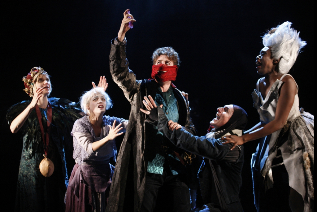 Clever use of shadow puppets tells big events, but the larger puppets aren’t quite animated enough to feel alive, particularly when belting out the showstoppers. Though Grinpayne and Dea, in the play’s most magical number, are introduced as two puppet children, they play with their own marionettes. When the blocks of their bodies slip away, the performers transform into the characters mid-song. It’s an ingenious transition that kicks the show up a notch. The camera necessarily adds a new dimension to the piece. But the size of the Old Vic’s stage is perfect fodder for simple camera coverage that captures the performance in its totality.