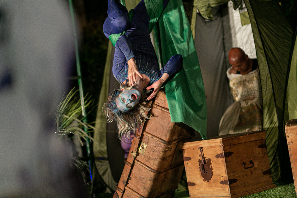Two-tiered scaffolding and billowing silks create the illusion of a ship with sails. A Peter Pan-esque vibe unfurls as Lauren Harling (Arial) uses her impish form to wrap and fall from the silks hypnotically. Nathanial Curtis brings much-needed humour to the play: from his camp portrayal of Trinculo to his improvisation as Ferdinand, he’s an integral part of the success of this adaptation, perfectly countering the dry banter from Thomas Judd in his dual roles as Sebastian and Stephano. There are Covid-friendly open tent pods for the cast’s frequent costume changes, and intermittent jokes like “Do you know how to furlough a spirit?” gently remind the audience that they are performing in unprecedented times.