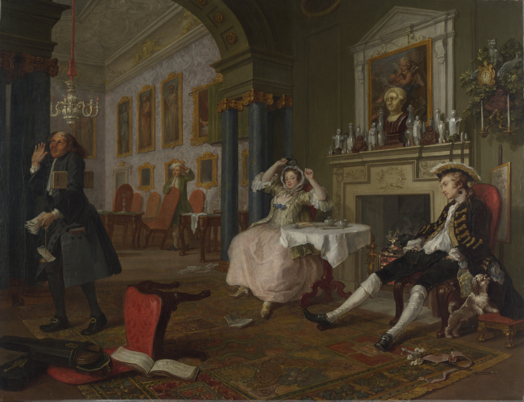There is a William Hogarth, depicting a slothful young married couple. He slumps in a chair with an unmistakable black mark of syphilis on his neck, while his dog sniffs at the mistress’s hat in his hand. She reclines with a smug expression, a proud clutch on a mirror. A violin, playing cards and books lie abandoned on the floor as a man leaves in exasperation clutching a ledger brimming with bills. The message seems clear: sin doesn’t pay.